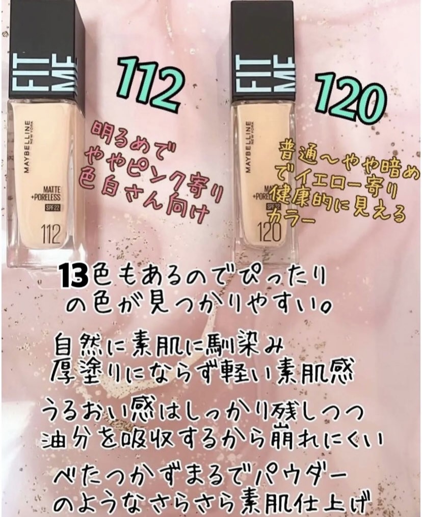 カラバリえぐ!!MAYBELLINENEWYORKフィットミーリキッドファンデーションR112、120ルミマットファンデ人気だけど、、、、フィットミーも負けてないのよ!!軽いつけ心地で肌にぴったり密着し、崩れにくいのがポイント!!毛穴やくすみ...