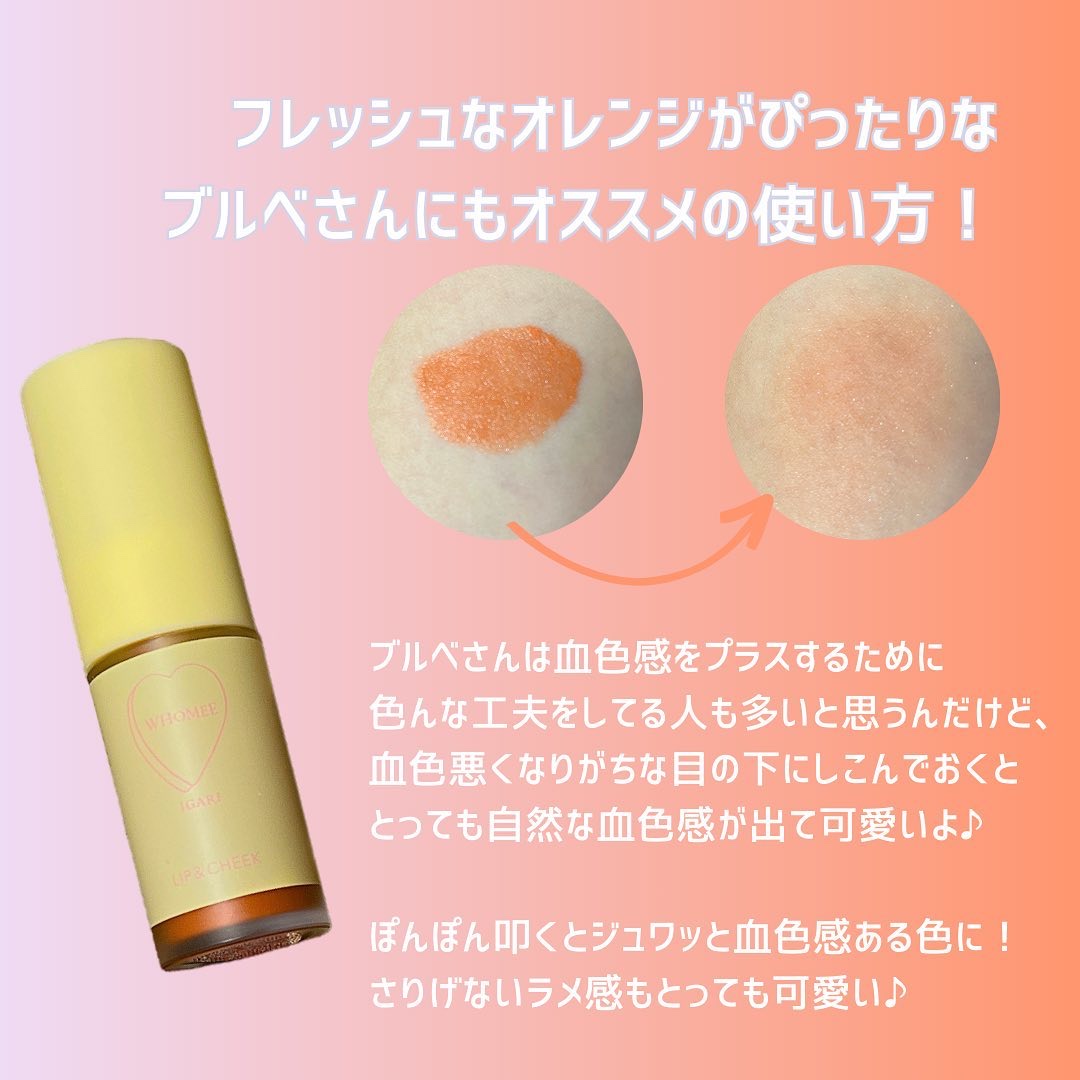 - ふんわりムースな塗り心地 キュンと色付くセミマット仕上げのリップ&チーク ①リップにもチークにも使えるアイテム リップとチークを同じ色にすることで、イガリの骨格理論に基づいた統一感のあるメイクが仕上がる どんな肌色にも似合う、唇にも頬にも使いやすい血色カラー※ ※メークアップ効果による ② ふんわりムースな塗り心地 ムースタッチの軽い付け心地で、ツヤとマットのいいとこどりな仕上がりに。 テクニックいらずで伸ばしやすく、リップ&チーク初心者さんにも使いやすいテクスチャー ③ ヨレにくい※処方でつけたてキープ 高発色で塗布後もヨレにくくつけたてをキープ※ ※自社調べ ④ 温かみのあるリッチなツヤ感 パールを高配合してベルベットのようなリッチで温かみのあるツヤ感 ⑤ イガリこだわりの容器デザイン WHOMEE初のベビーイエローのマットな質感の容器 セミマットさを演出し、遊び心のあるパッケージ