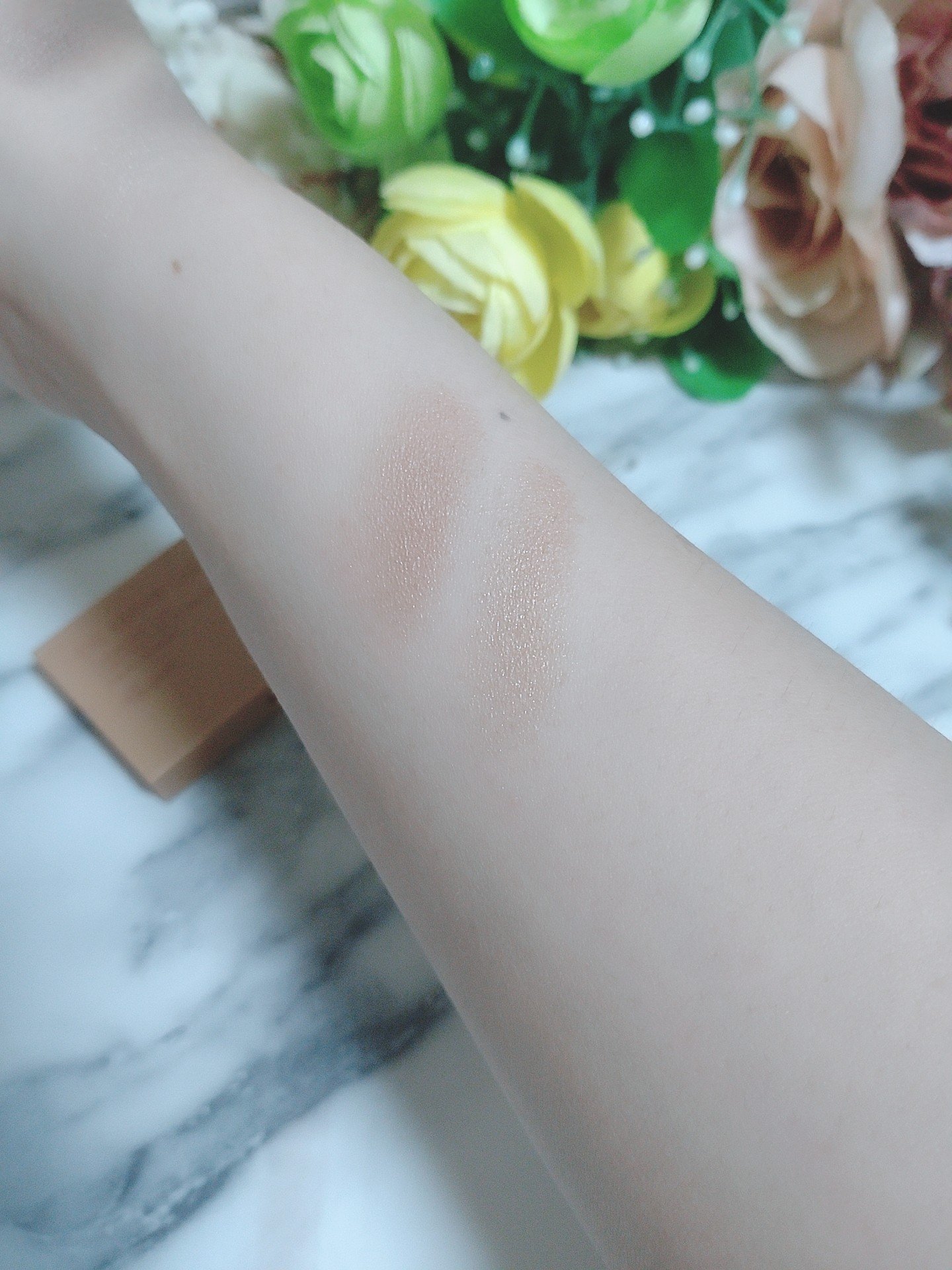 イエローを全体に塗ったあと鼻筋や目の下にラベンダーを塗りますが、テスターで試した手が帰るときにはパールですごくきれいな手になってる!!肌の見え方が違いました。これはラベンダーのほうのパールなのかな。 イエローは正直可も不可もなく、すごく保湿力を感じるとかもなかったのですが、ラベンダーはそれなりにトーンアップしてくれて、ハイライト効果有りです👍🏻✨