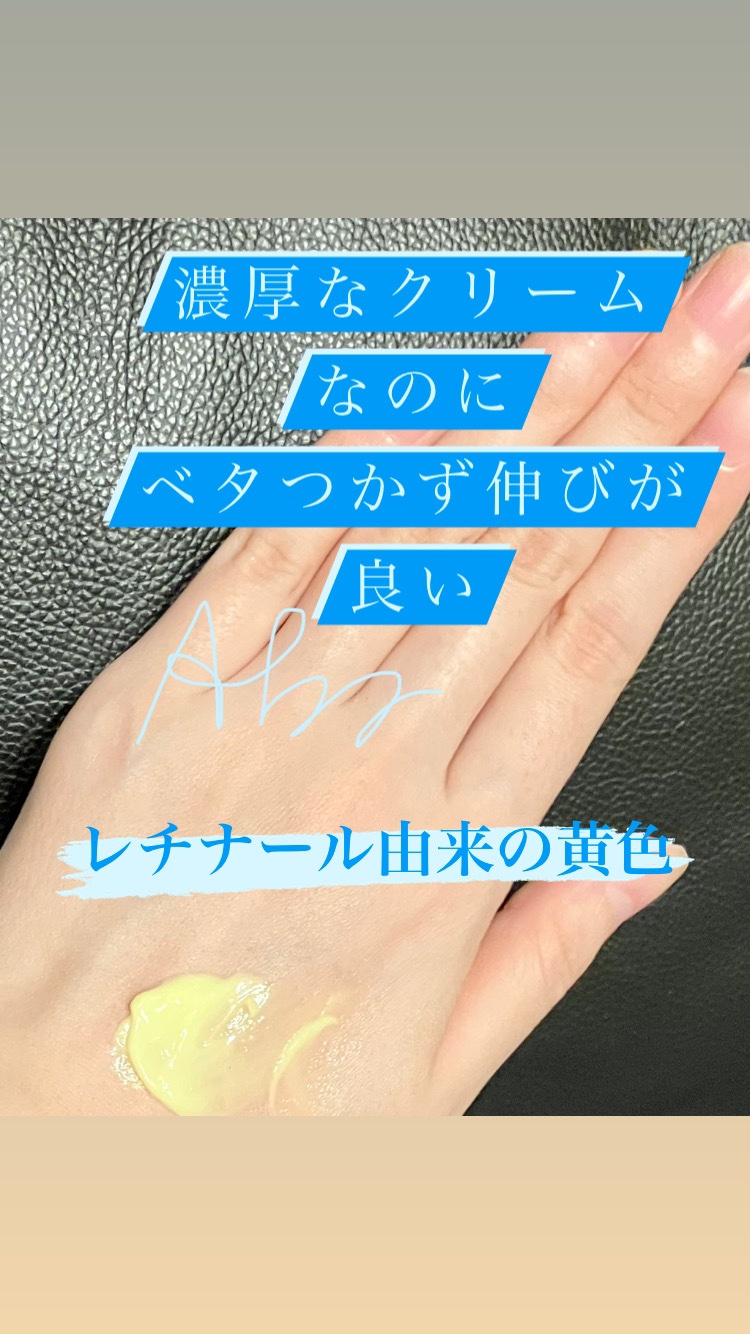 このクリームは、レチナールという成分とバクチオールという成分を配合していて、レチノールコスメより低刺激な処方設計なのも嬉しいポイント。 鮮やかなイエローカラーが特長的なクリームが出現! クリームはやわらかめのテクスチャーで伸びもよくなじみもはやい。 しっとりしていて、ベタつきなくサラッとした仕上がりに。 このクリームは全く刺激を気にせず使えるので嬉しい。 容器もエアレスタイプになっていて劣化しにくいのも良いと思うし、何より使いやすいからおすすめ!