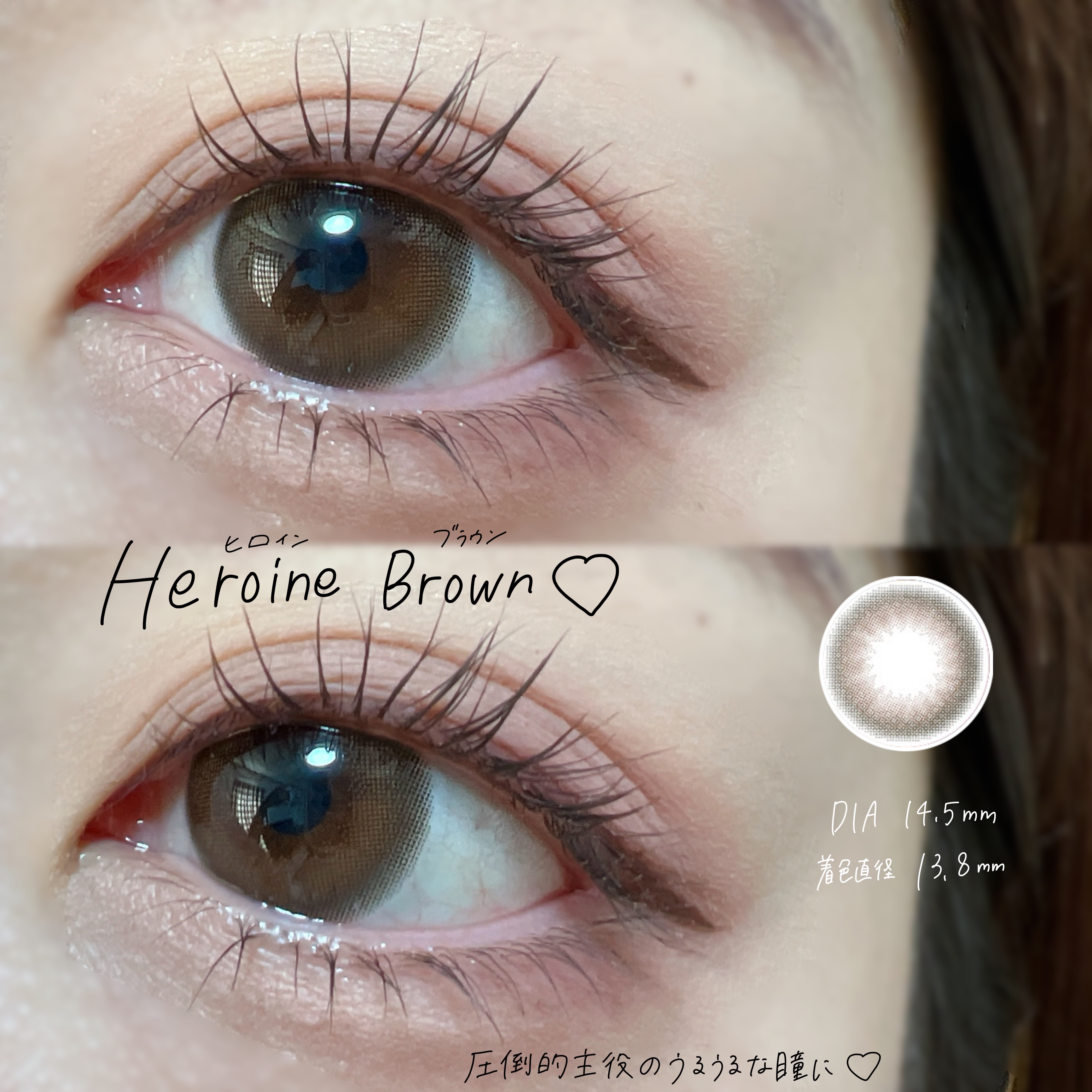 - ※2025年6月以降、商品パッケージ裏面・側面の一部表記を順次変更いたします。尚、これにかかる商品の交換・返品は承っておりません。 ヒロインの瞳の法則♡ ナチュラルなのにしっかり盛れるDIA14.5mm! ■ヒロインブラウン 透明感たっぷりなブラウンレンズ。瞳に馴染む色だからとってもナチュラル。 ■アイドルリング さりげない細フチとちゅるんブラウンがナチュラルに瞳を強調♡ ■ライアーピンク ピンクブラウンのフチとムラのあるデザインで立体感のあるきらきらな瞳を演出♡ ■レディブラック じゅわっとぼかした繊細なデザインで透明感に満ちた存在感のある瞳を演出♡ ■プリンセスショコラ しっかり太フチとあまくとろけるショコラブラウンでプリンセスみたいに愛される瞳に♡ ■スターグロー くりっと盛れる太フチとうるみツヤめく水光カラーで光を取りこむキラツヤな瞳に♡ ■Maria Ring(マリアリング) 絶妙細フチと白っぽ透明感グレージュでちょっぴり背伸びした余裕仕込みレンズ♡ ■Mermaid Ring(マーメイドリング) 絶妙太フチときらめき透明感マーメイドグレーでピュアにうるめく美少女な瞳に♡ カラーコンタクトレンズの不適正使用による眼障害の危険性等などがあります。 ●コンタクトレンズは高度管理医療機器です。不十分な洗浄・消毒など不適切なケアや、長時間・交換期間を超えた装用により、アレルギー性結膜炎、角膜感染症、角膜潰瘍等の重篤な眼障害が発生する危険性があります ●ご使用前に取扱説明書を確認してください 使用上の留意事項 ●眼科医院等を受診してからお求めください ●眼に異常を感じたら直ちにレンズ使用を中止し、お近くの眼科等で診察を受けてください ●医師の指示にしたがってご使用ください ●コンタクトレンズを装用する場合、自覚症状がなくても、眼科医院等での定期検査を受けてください ●レンズに不具合がある場合は使用しないでください