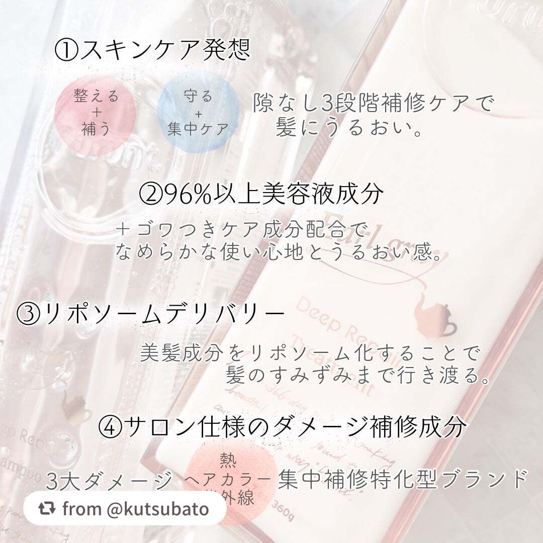 - 美容室メーカーが 366日かけて開発した 貯水リペア美容のぷるサラ髪 髪の内部や地肌の角質層のすみずみまで行きわたる「リポソーム(美髪カプセル)*1」に着目。 髪の構成成分のひとつで、水分を保ち髪の栄養分の流出を防ぐCMC*2 を補修する「CMC補修成分」※1と、 「3大ダメージ補修成分」※2 を独自バランス*3 で調合した、 スキンケア発想の「熱・ヘアカラー・紫外線」ダメージ集中補修ケアブランドです。 *1 生体組成成分リン脂質からなる微小カプセルのこと *2 細胞膜複合体の略称 *3 製品への配合比率 ※1 ジラウロイルグルタミン酸リシンNa、ラウロイルグルタミン酸ジ(フィトステリル/オクチルドデシル)(すべて補修) ※2 加水分解卵殻膜、リンゴ酸ジイソステアリル(シャンプーのみ)、(加水分解シルク/PGプロピルメチルシランジオール)クロスポリマー(トリートメント・ヘアオイル ・ヘアマスクのみ)、γ-ドコサラクトン、ココイル加水分解ケラチンK(羊毛)(シャンプーのみ)、加水分解ケラチン(羊毛)(トリートメント・ヘアオイル ・ヘアマスクのみ)、フェルラ酸、フラーレン(すべて補修)