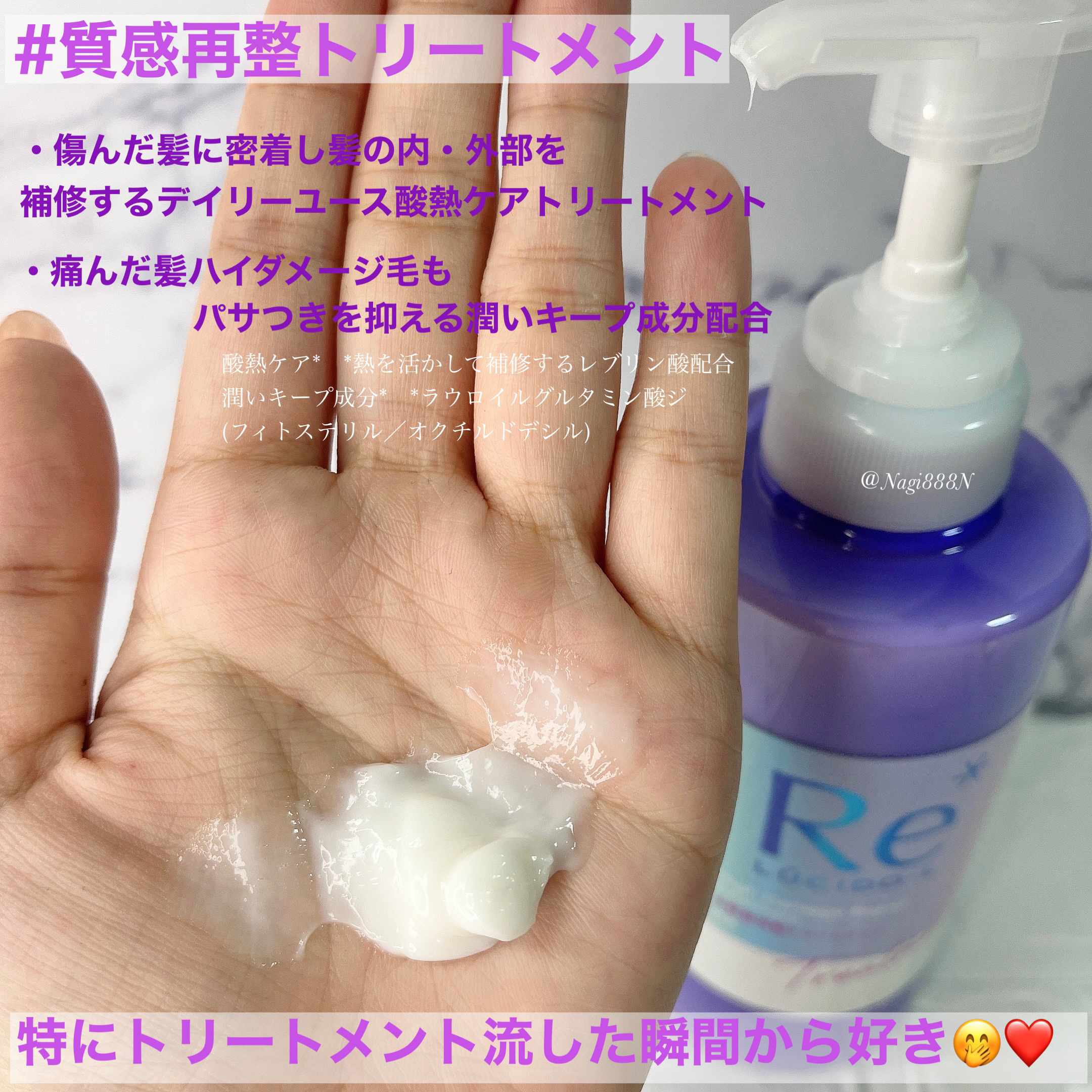 - <シャンプー> もちもちの泡で摩擦ダメージを抑え、きしみ・引っ掛かりのない操作性で傷んだ髪をなめらかに洗い上げる酸熱ケアシャンプー。ドライヤーやヘアアイロンの熱を活かしてうねり・くせ・広がり等のハイダメージ毛をまとまるツヤ髪に導きます。 〇キンモクセイ×グレープフルーツの香り 〇酸熱トリートメント成分*1配合 〇ヒートリペア成分2*配合 〇カラーキープ成分*3配合 〇アミノ酸系洗浄成分配合 〇ラウレス硫酸塩フリー 〇パラベンフリー <トリートメント> 傷んだ髪に密着し髪の内・外部を補修。ダメージでパサつく髪にうるおいのある保湿感が持続する酸熱ケアトリートメント。ドライヤーやヘアアイロンの熱を活かして、うねり・くせ・広がり等のハイダメージ毛をまとまるツヤ髪に導きます。 〇キンモクセイ×グレープフルーツの香り 〇酸熱トリートメント成分*1配合 〇ヒートリペア成分*2配合 〇潤いキープ成分*4配合 〇パラベンフリー *1レブリン酸(毛髪補修) *2メドウフォーム-δ-ラクトン *3リンゴ酸ジイソステアリル(毛髪保護) *4ラウロイルグルタミン酸ジ(フィトステリル/オクチルドデシル)