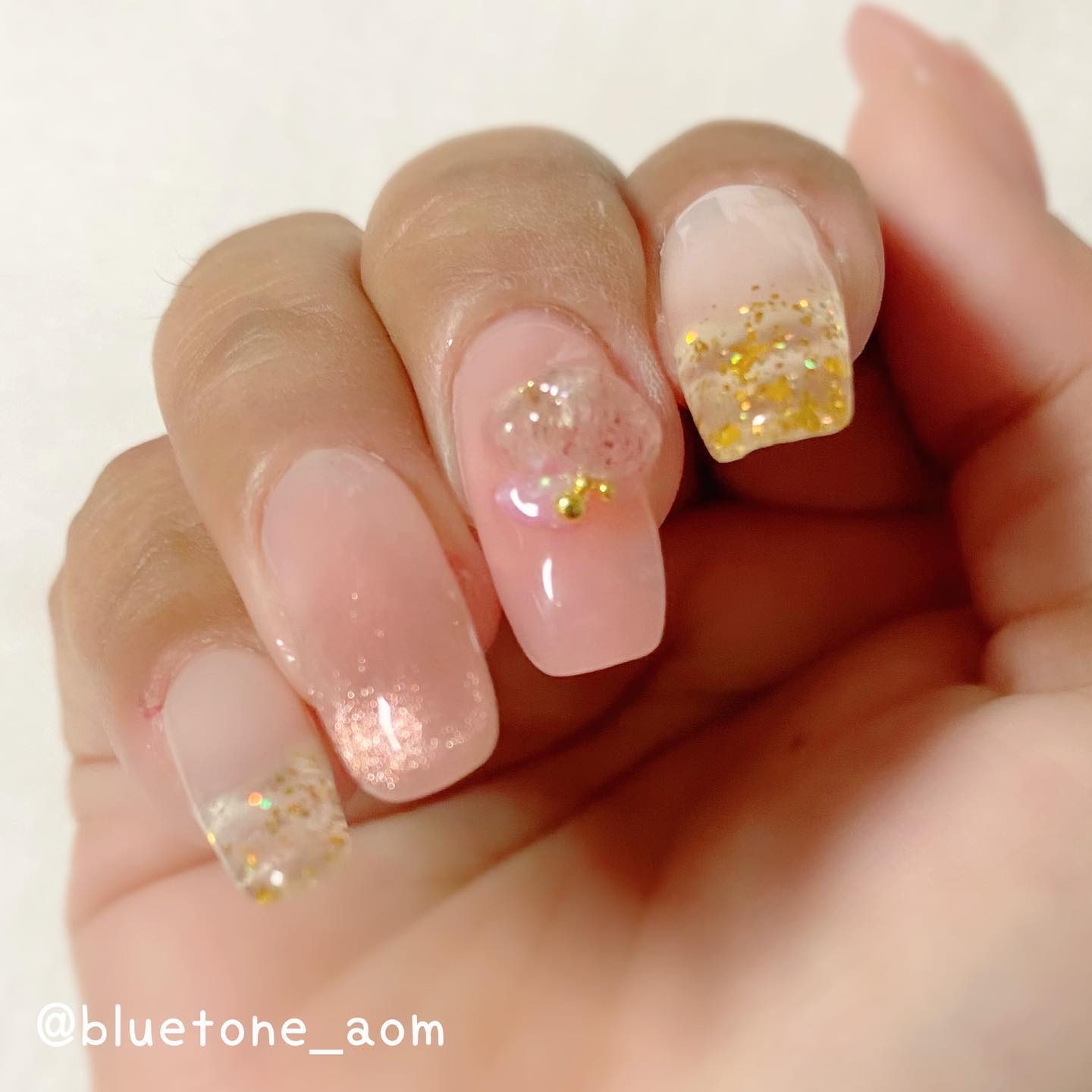 ラメがしっかりしてるし クリアカラーが入ってるから オーロラパウダー無しでも 充分キラキラしました! 反射強めのフィルムなので 実物はもっと うるうるとキラキラが強いです! ビー玉みたい🥺 ネイルシール長持ちさせたいけど ちょっと飽きてきたな〜って時とかに 全然違った印象になるのでオススメです! Seriaのベースジェル 本当にうるうるネイルしやすいので オススメしたい🙆♀️