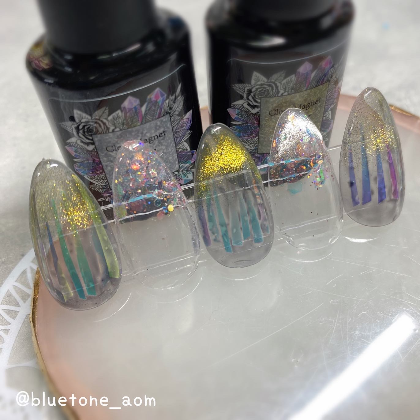ベースカラーを塗ったらノンワイプトップを塗って硬化します。 クリア→ミラー感はあるけど、発色はそこまで濃くないのでガッツリシルバーを求めてる人は物足りないかも🤔 ホワイト→キレイにシルバーになりました! ミルキーホワイト→シャンパンゴールドみたいな落ち着いたゴールドっぽくなりました😳 ブラック→キレイにシルバーに!やっぱりブラックとシルバーは映えますね🤝ギラギラです! パウダーの粒子はちょっと大きめなのでちょっと不安でしたが擦ってみるとキレイにミラーになりました! ベースカラーで見え方も変わるので色々試しても面白いかもです🥰