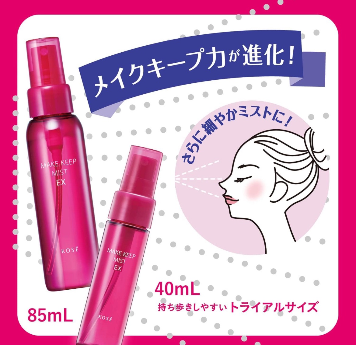 - メイクキープ力がパワーアップ! メイクの仕上げにサッとひと吹き、化粧くずれを防ぐふんわりミストスプレー。 メイクキープ力がパワーアップ! ウォータープルーフ効果に加え、皮脂くずれ防止効果で驚きのメイクキープ力を発揮します。 ● さらに細かくふんわりと噴霧するミストに進化。均一な一枚の膜を作ります。 ● つけたての美しいメイクを長時間持続。 メイクコート成分配合。しっかりとメイクを固定しながら、顔の動きに合わせて伸縮するため、時間がたってもメイクがヨレにくく、美しい仕上がりを長時間持続します。 ● マスク着用によるメイクのヨレを防止し、マスクにメイクが付きにくくします。 ● メイクくずれから守るだけでなく、大気中の微粒子(ちり・ほこりなど)からも肌をまもります。 ● 汗や水、皮脂まではじくため、メイクによるテカリやにじみをしっかりと抑えます。 ● 保湿成分配合。うるおいを与えて乾燥を防ぎます。 ● フレッシュフローラルの香り ● 無着色 <ご注意> 低温下では中身が白く固まりやすくなりますが、 常温に戻すために湯せんや電子レンジなどを使って高い温度で温めると品質が変化してしまいます。 さらには容器が変形・破損することで、やけどや怪我の恐れがあります。 大変危険ですので、湯せんや電子レンジなどを使って加熱することは絶対にお避けください。