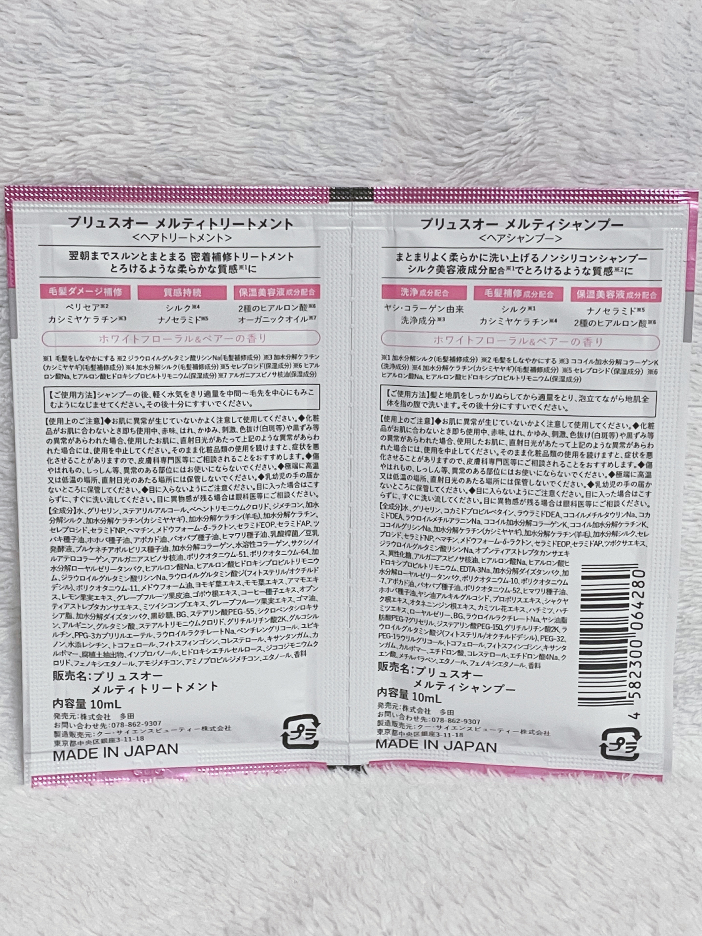 同じプリュスオーの『絡まる髪も指通りなめらか』のメロウのシャントリが良かったので、うねり・広がりやすい自分はこちらの『広がる髪も柔らかまとまる』メルティも試したくなって購入。 シャンプーはとろっとしてるテクスチャー。ボトル半分程になるまで使ってみて、メロウと比べて明らかに仕上がりが違うとかは感じなかったけど、こっちのほうが洗浄力はしっとりしてるような? シリーズ共通してボトルがスリムなの良い。