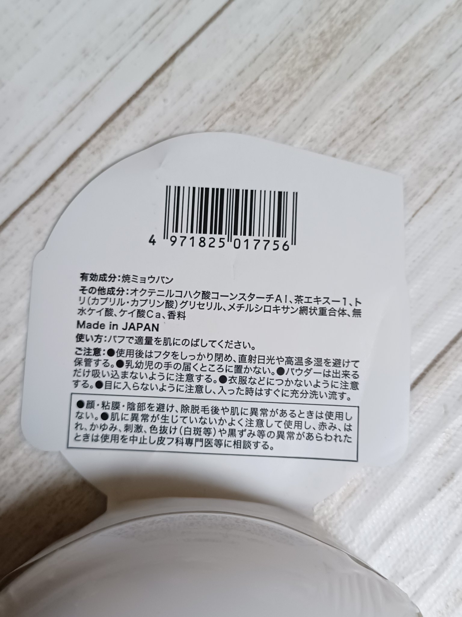- <15g> 有効成分:焼ミョウバン その他成分:オクテニルコハク酸コーンスターチAl、茶エキスー1、トリ(カプリル・カプリン酸)グリセリル、メチルシロキサン網状重合体、無水ケイ酸、ケイ酸Ca、香料 <トライアル 7g> 有効成分:焼ミョウバン その他成分:オクテニルコハク酸コーンスターチAl、茶エキスー1、トリ(カプリル・カプリン酸)グリセリル、メチルシロキサン網状重合体、無水ケイ酸、ケイ酸Ca、香料