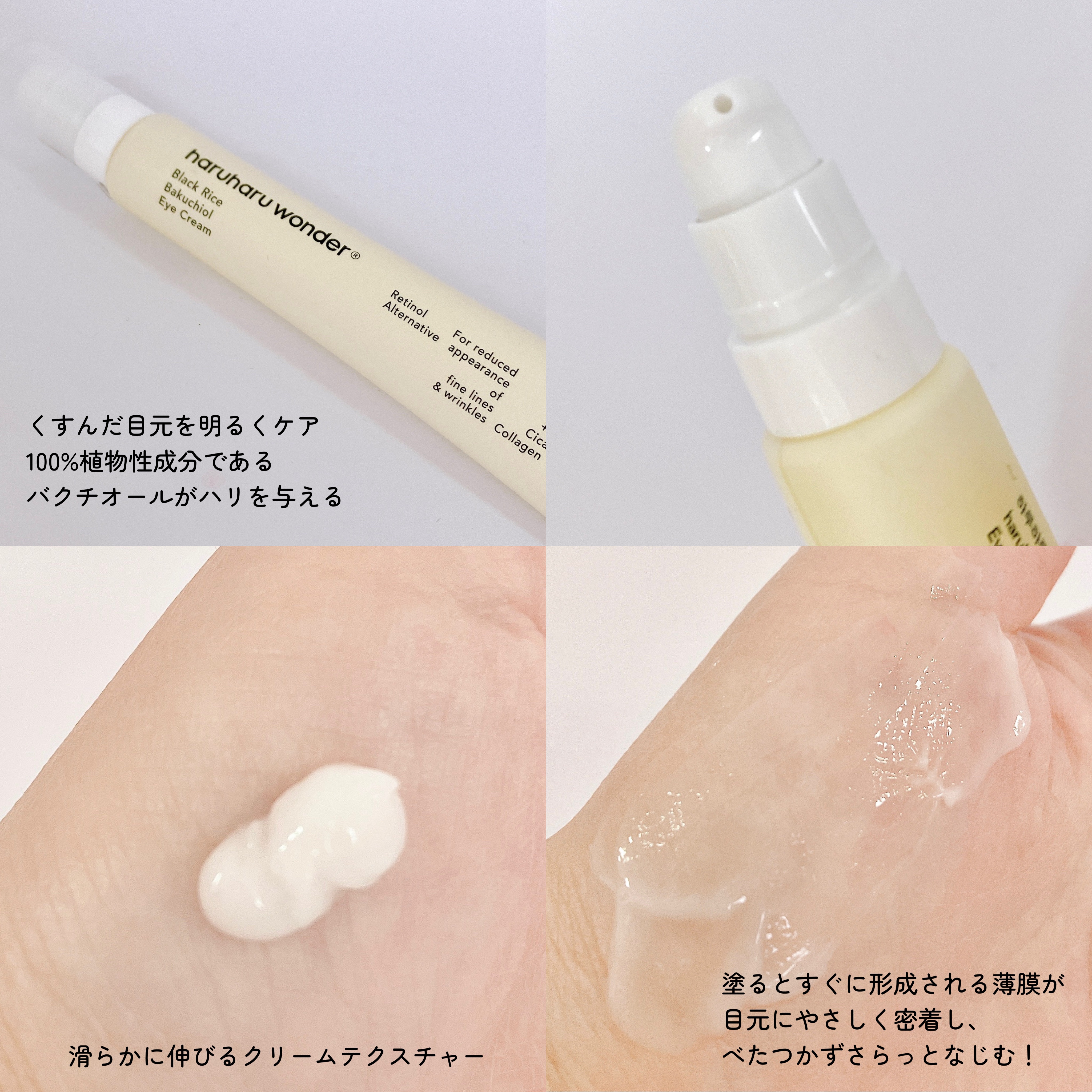 haruharuwonderブラックライスバクチオールアイクリーム⎯⎯⎯⎯⎯⎯⎯⎯⎯⎯⎯⎯\目元の悩みにアプローチ!/高純度の天然由来の活性成分の植物性バクチオール配合のアイクリーム。なめらかなテクスチャーで肌なじみが良く、しっとりとしたお肌...