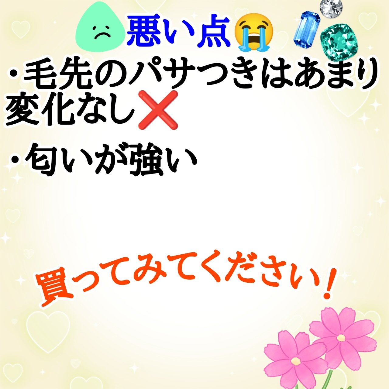 | ヘアケア・スタイリングランキング第119位 | 洗い流す時からサラサラ。 ドライヤー後に感動。髪の毛1本1本がパラッパらのサラッサラになるの!!! | 詳細を見る | |