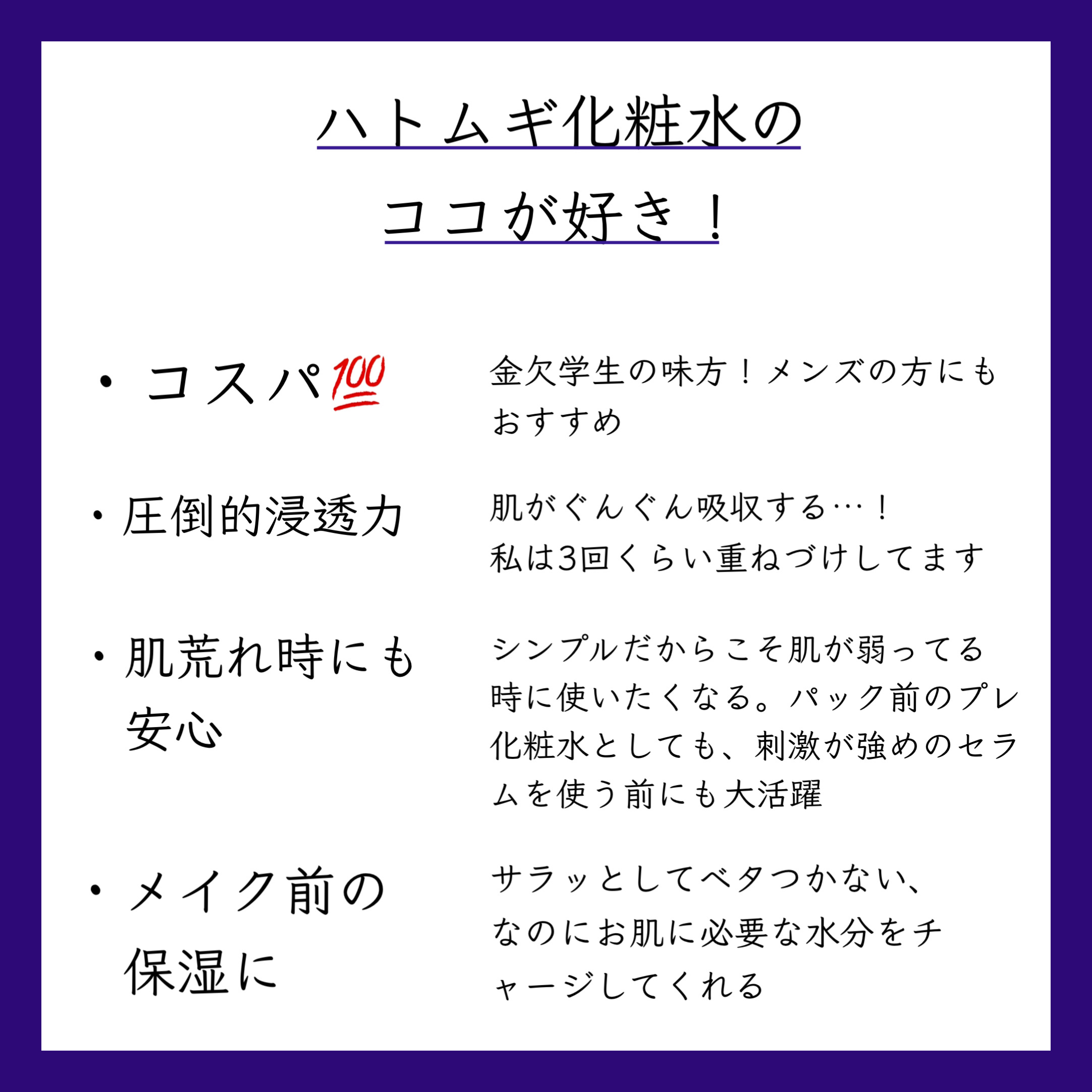 ハトムギ化粧水のどこがそんなにいいの!?今回初めて使ってみてすごいところがたくさんあったのでレビュー!みずみずしいテクスチャーで肌にぐんぐん浸透し、角層のすみずみまでしっかり水分補給💦乾燥が気になる肌にもやさしくなじみ、うるおいのある健やかな...