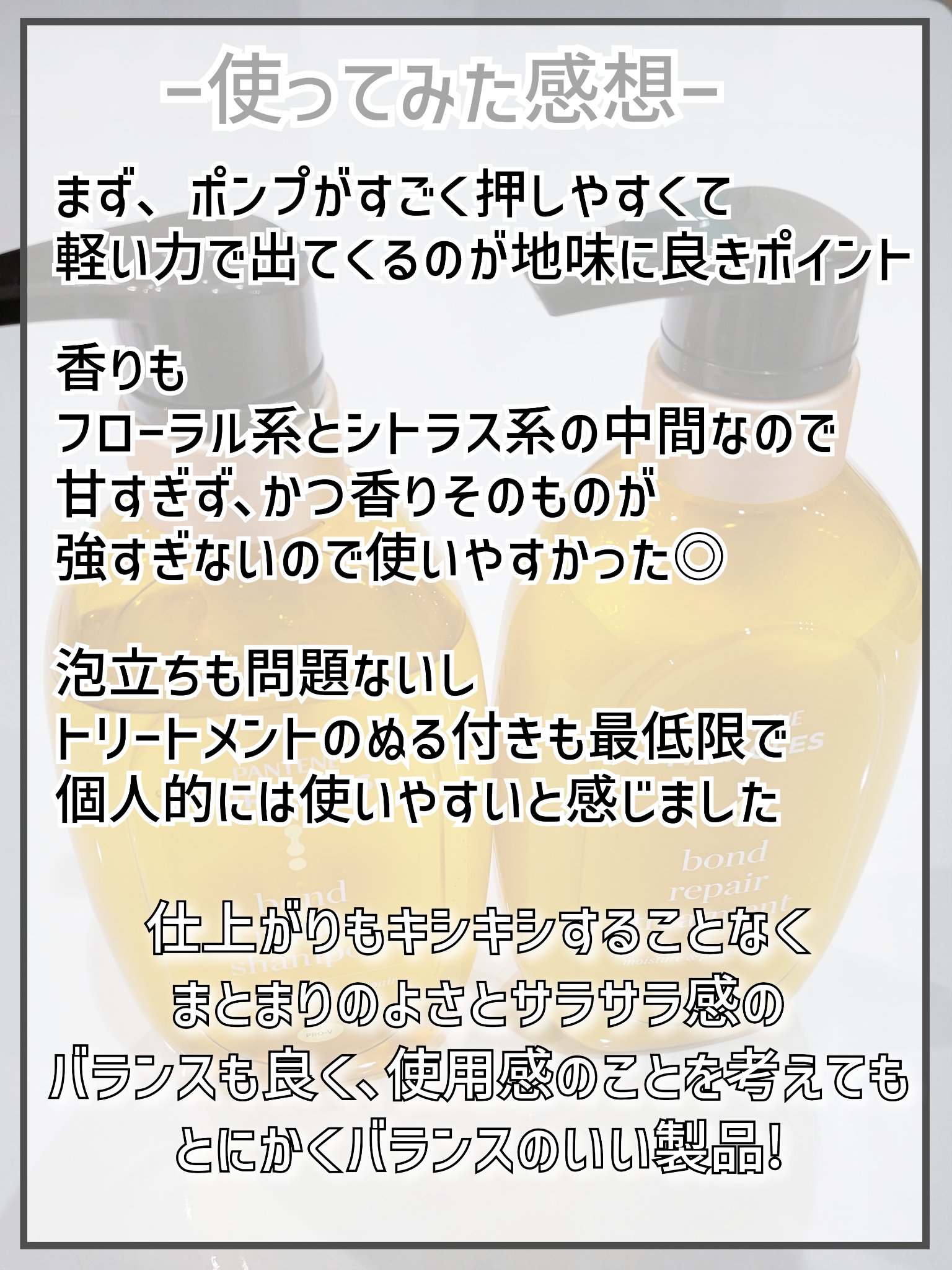 髪のパサつき・ダメージ・まとまりのなさがきになっていたのですが、こちらは大人のうねりコントロールをうるおいユースセラム処方でアプローチしてまとまる髪へと導く手助けをしてくれます💓 泡立ちが良くきめ細やかな泡でシャンプーした後は櫛が通りやすいちゅるんとした髪になります。キシキシ感もなく、優しいフルーティーな香りが広がって洗い上がりも良いです💕 柔らかなテクスチャーが髪に馴染みやすく浸透させている最中からするすると手触りの良い髪になっていると実感しました!