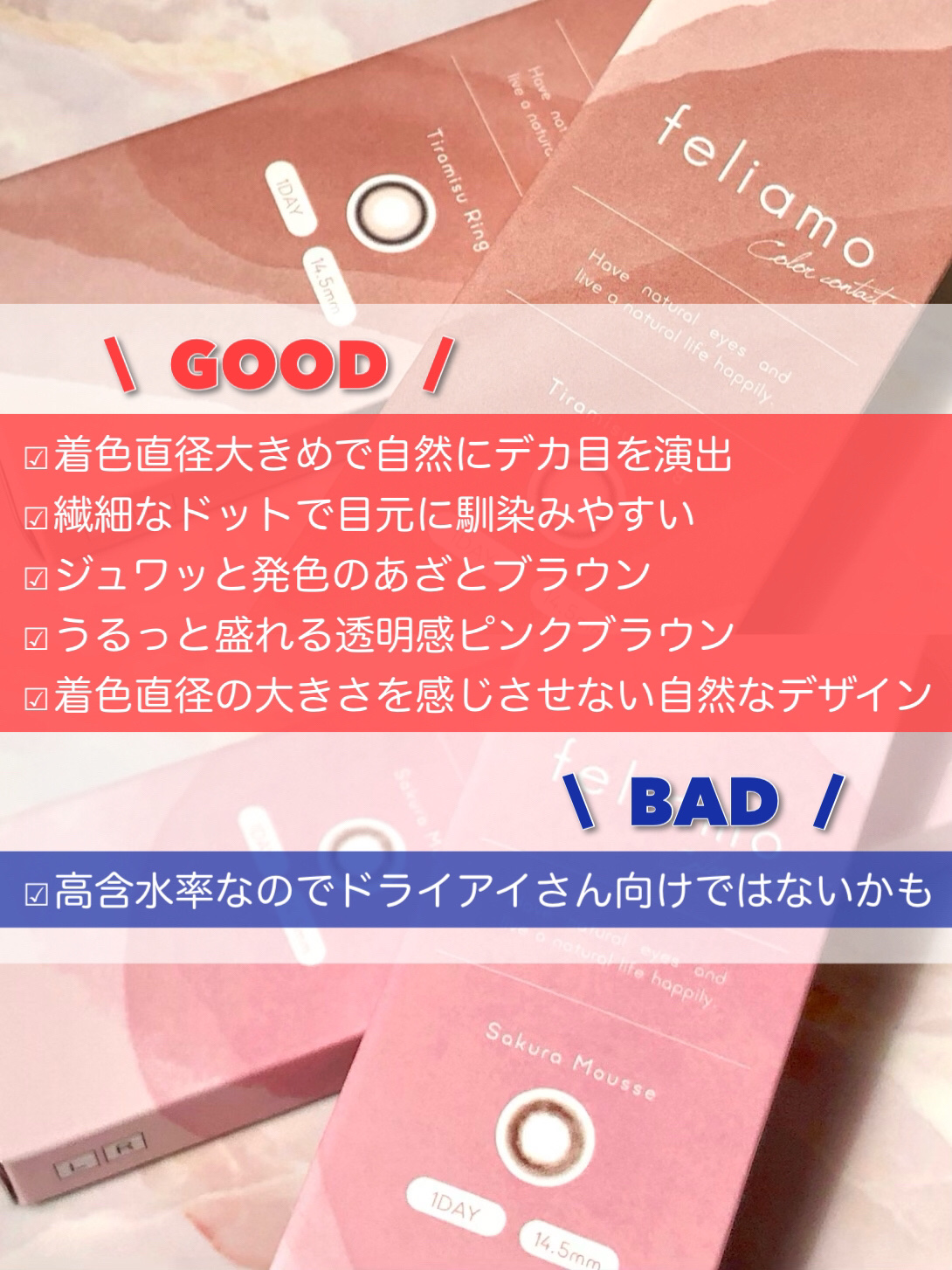 - ※2025年6月以降、商品パッケージ裏面・側面の一部表記を順次変更いたします。尚、これにかかる商品の交換・返品は承っておりません。 どんな瞬間にも溶け込む誰からも愛される瞳へ feliamoの由来は felice amore~幸せな愛~ 瞳から愛されオーラを放つ好印象レンズで女性らしさと品を演出。 オンも、オフも、特別な日も。 どんな場面にも溶け込むレンズラインナップで誰からも愛される瞳に。 UV CUT Feature1 肌や瞳に有害といわれ、白内障などの眼病を引き起こす危険性のある紫外線を99%カットします。(UV-A波75%、UV-B波99%カット) イオン性 Feature1 水分を多く含み酸素を通しやすいため瞳にやさしい使い心地で、快適な装用感です。 高含水 Feature1 水分が多く含むやわらかい素材で、快適なつけ心地です。 レンズ構造 Feature1 まぶた側に着色剤を内包しているため、角膜に色素が触れることがない構造を採用しています。 レンズ形状 Feature1 フチを丸みのある形状にすることで自然な装用感を実現しました。 ※装用感には個人差があります。 カラーコンタクトレンズの不適正使用による眼障害の危険性等などがあります。 ●コンタクトレンズは高度管理医療機器です。不十分な洗浄・消毒など不適切なケアや、長時間・交換期間を超えた装用により、アレルギー性結膜炎、角膜感染症、角膜潰瘍等の重篤な眼障害が発生する危険性があります ●ご使用前に取扱説明書を確認してください 使用上の留意事項 ●眼科医院等を受診してからお求めください ●眼に異常を感じたら直ちにレンズ使用を中止し、お近くの眼科等で診察を受けてください ●医師の指示にしたがってご使用ください ●コンタクトレンズを装用する場合、自覚症状がなくても、眼科医院等での定期検査を受けてください ●レンズに不具合がある場合は使用しないでください