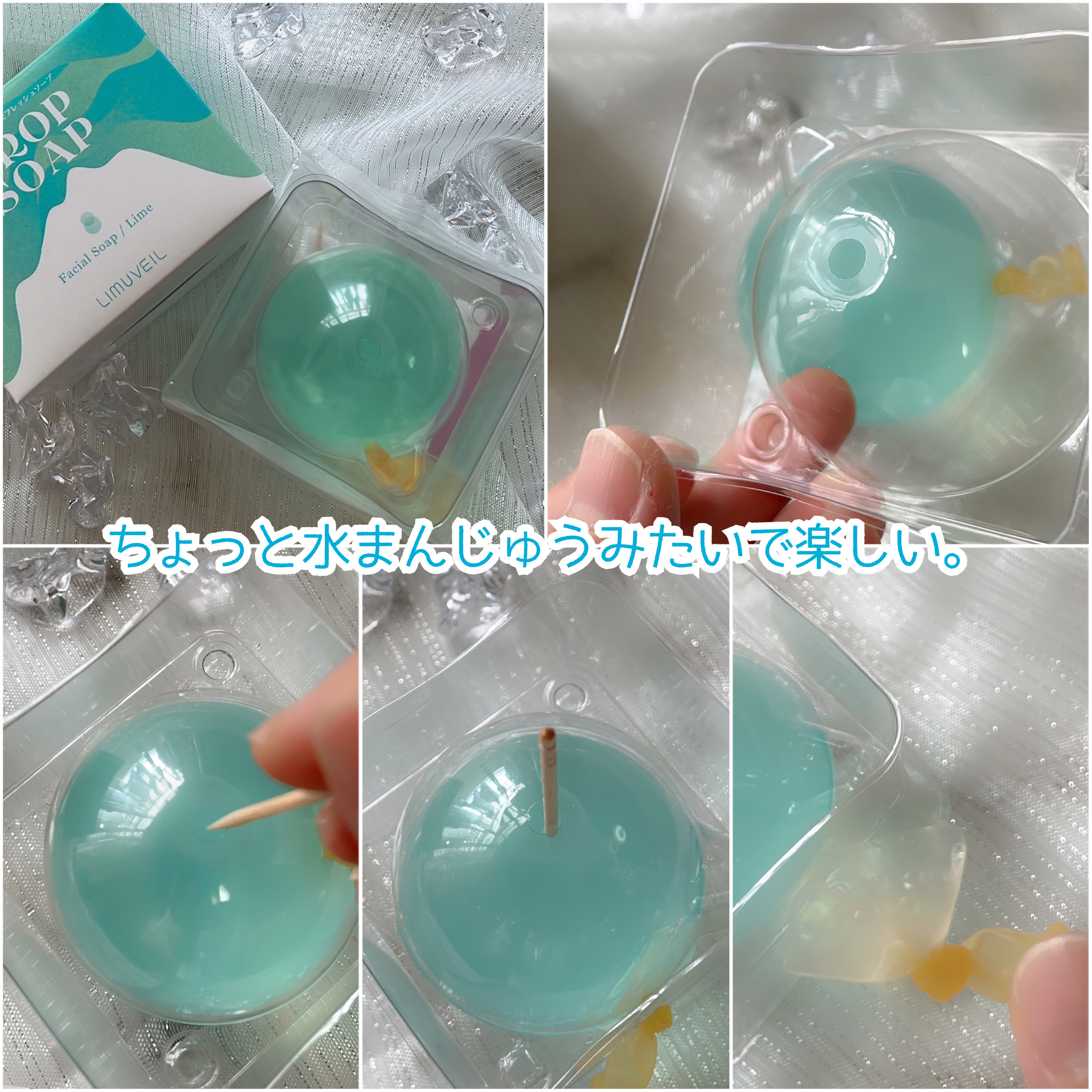 - ・ゼリーのような「ぷるんぷるん」と柔らかいドロップソープは、美容成分を贅沢配合した美容液のような洗顔石鹸です。含まれている美容成分の種類の違いにより、マリン、ライム、ラベンダーと3種類が用意されています。 ・このライムに含まれた美容成分は、セラミド3,セラミド6Ⅱ,セラミド1,フィトスフィンゴシなどの整肌成分。フコイダンを中心とした、ヒアルロン酸、プラセンタなどの保湿成分も贅沢に配合しています。 ・固形石鹸でありながら保湿美容成分を贅沢に配合することを実現。ぷるんぷるんのゼリーがその秘密!かわいいだけじゃない、高機能な石鹸です。 ・アミノ酸系洗浄成分を使用しているので、泡も肌にやさしい使い心地、毛穴まで*美容成分が浸透します。乾燥肌や敏感肌の方にも。洗い上がりはしっとり、もっちりした仕上がりで 肌印象が明るくなる”うるツヤ肌”へ *角質層まで ・不思議な感触のドロップソープは風船に包まれているので、付属の楊枝で穴をあけて石鹸を取り出します。最初に手にした方は「これが石鹸なの?」とビックリすることでしょう。使用感、触っているときの心地良さを追求したぷるぷる洗顔です。 ・日常的な洗顔の手入れに活躍するのはもちろん、お誕生日、母の日など女性向けのプレゼントにはもってこい!もらった方が驚き、喜ばれること間違いなし!また、最近流行りのメンズ洗顔用としてのプレゼントもありですね! ・主な保湿成分であるフコイダンは、海藻から抽出された成分で見えないベールで大切なお肌を包み込んでくれます。一度洗顔すると毎朝、夜の洗顔が楽しみになるはすです!更に洗顔と一緒にハンドケアもできちゃいます! ・日常の朝晩の洗顔で約2ヶ月ぐらい長持ちするので、トータルなコスパも悪くないです。