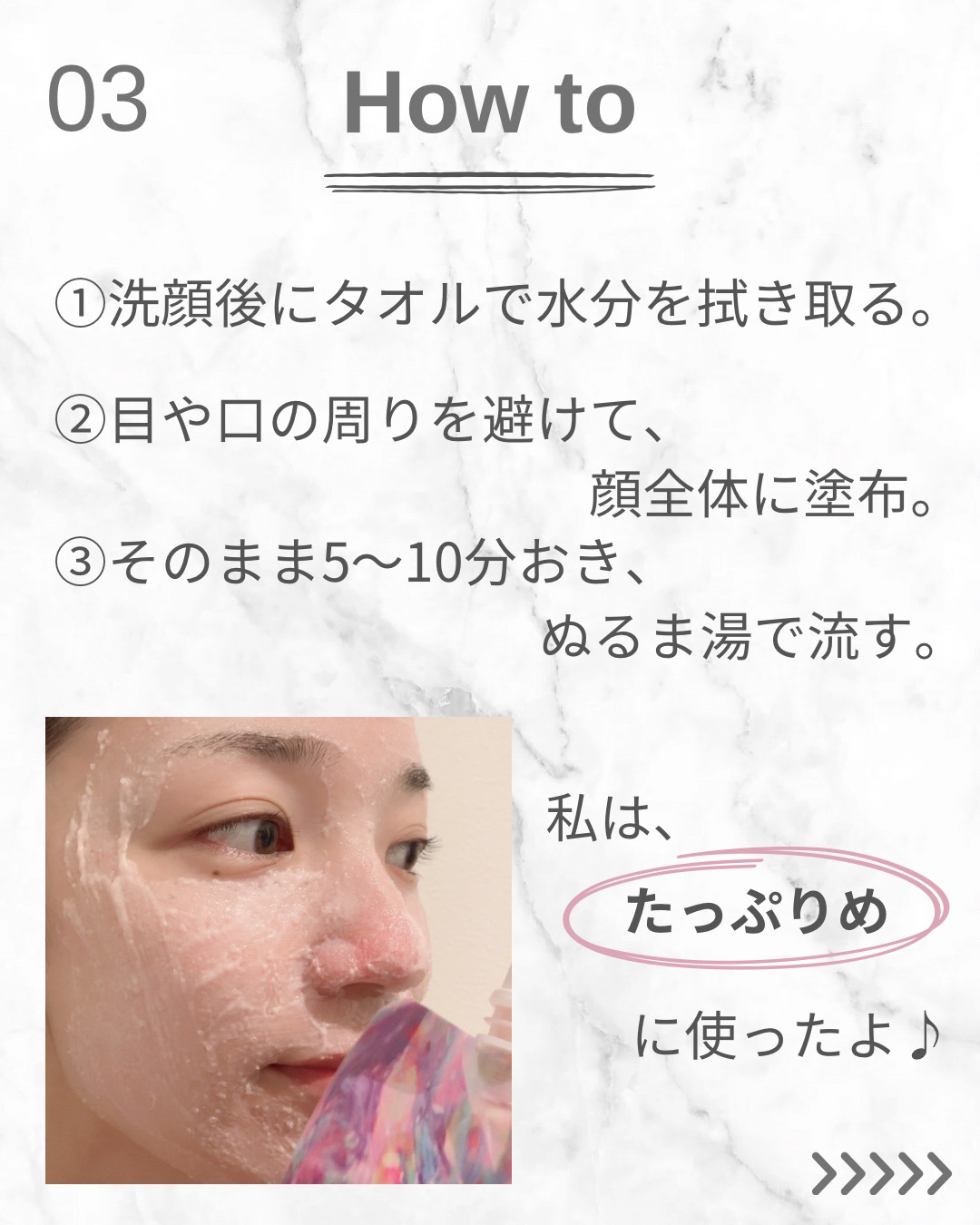 - 柔らかいテクスチャーの洗い流すパック。 角質ケアをし肌を滑らかに整え、さらに洗いあがりもつっぱり感を感じにくく、しっとり潤います。