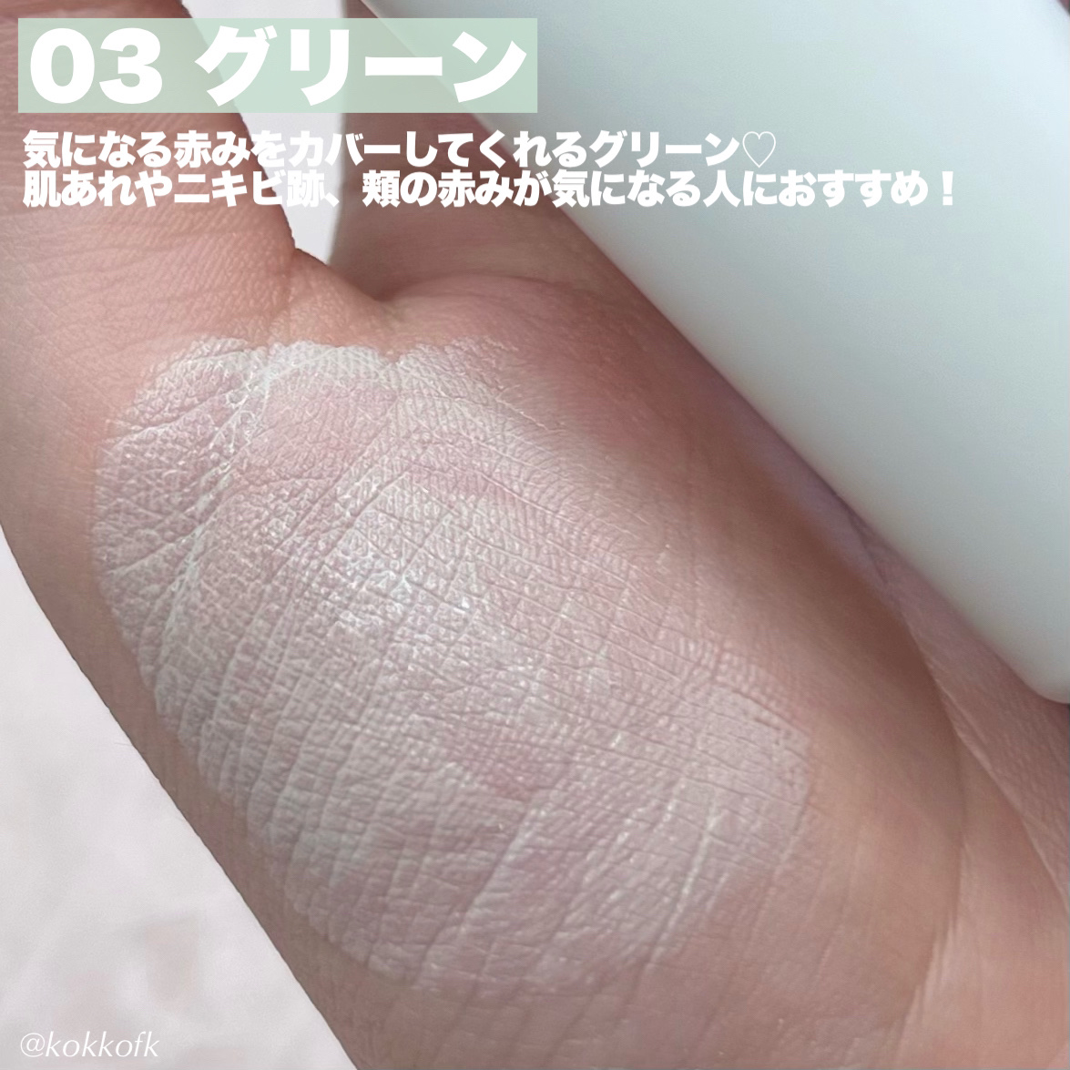 - <01 ラベンダー> 水、シクロペンタシロキサン、タルク、ジメチコン、エタノール、ジカプリン酸ネオペンチルグリコール、ジカプリン酸PG、メチルトリメチコン、メトキシケイヒ酸エチルヘキシル、(ジメチコン/ビニルジメチコン)クロスポリマー、ラウリルPEG-9ポリジメチルシロキシエチルジメチコン、PEG-9ポリジメチルシロキシエチルジメチコン、(ジフェニルジメチコン/ビニルジフェニルジメチコン/シルセスキオキサン)クロスポリマー、BG、ポリメチルシルセスキオキサン、セリン、ツボクサ葉エキス、トコフェロール、ドクダミエキス、ヒアルロン酸Na、モモ葉エキス、ラベンダー油、水溶性コラーゲン、BHT、シリカ、ジステアルジモニウムヘクトライト、スクワラン、ステアラルコニウムヘクトライト、セスキオレイン酸ソルビタン、ハイドロゲンジメチコン、レシチン、塩化Na、合成フルオロフロゴパイト、水酸化Al、窒化ホウ素、フェノキシエタノール、メチルパラベン、グンジョウ、マイカ、酸化チタン、酸化亜鉛、赤226 <02 ピンクベージュ> 水、シクロペンタシロキサン、タルク、ジメチコン、エタノール、ジカプリン酸ネオペンチルグリコール、ジカプリン酸PG、メチルトリメチコン、メトキシケイヒ酸エチルヘキシル、(ジメチコン/ビニルジメチコン)クロスポリマー、ラウリルPEG-9ポリジメチルシロキシエチルジメチコン、PEG-9ポリジメチルシロキシエチルジメチコン、(ジフェニルジメチコン/ビニルジフェニルジメチコン/シルセスキオキサン)クロスポリマー、BG、ポリメチルシルセスキオキサン、セリン、ツボクサ葉エキス、トコフェロール、ドクダミエキス、ヒアルロン酸Na、モモ葉エキス、ラベンダー油、水溶性コラーゲン、BHT、シリカ、ジステアルジモニウムヘクトライト、スクワラン、ステアラルコニウムヘクトライト、セスキオレイン酸ソルビタン、トリエトキシカプリリルシラン、ハイドロゲンジメチコン、レシチン、塩化Na、合成フルオロフロゴパイト、水酸化Al、窒化ホウ素、フェノキシエタノール、メチルパラベン、酸化チタン、酸化亜鉛、酸化鉄 <03 グリーン> 水、シクロペンタシロキサン、タルク、ジメチコン、エタノール、ジカプリン酸ネオペンチルグリコール、ジカプリン酸PG、メチルトリメチコン、メトキシケイヒ酸エチルヘキシル、(ジメチコン/ビニルジメチコン)クロスポリマー、ラウリルPEG-9ポリジメチルシロキシエチルジメチコン、PEG-9ポリジメチルシロキシエチルジメチコン、(ジフェニルジメチコン/ビニルジフェニルジメチコン/シルセスキオキサン)クロスポリマー、BG、ポリメチルシルセスキオキサン、セリン、ツボクサ葉エキス、トコフェロール、ドクダミエキス、ヒアルロン酸Na、モモ葉エキス、ラベンダー油、水溶性コラーゲン、BHT、シリカ、ジステアルジモニウムヘクトライト、スクワラン、ステアラルコニウムヘクトライト、セスキオレイン酸ソルビタン、トリエトキシカプリリルシラン、ハイドロゲンジメチコン、レシチン、塩化Na、合成フルオロフロゴパイト、水酸化Al、窒化ホウ素、フェノキシエタノール、メチルパラベン、グンジョウ、酸化チタン、酸化亜鉛、酸化鉄 <20 シアーベージュ> 水、BG、DPG、メトキシケイヒ酸エチルヘキシル、ミネラルオイル、ジエチルアミノヒドロキシベンゾイル安息香酸ヘキシル、トリエチルヘキサノイン、ステアリン酸、シリカ、アスコルビン酸、セリン、ツボクサ葉エキス、トコフェロール、ドクダミエキス、ヒアルロン酸Na、モモ葉エキス、水溶性コラーゲン、BHT、PEG-32、PEG-6、TEA、(ジフェニルジメチコン/ビニルジフェニルジメチコン/シルセスキオキサン)クロスポリマー、アクリレーツコポリマー、カルボマー、キサンタンガム、ジメチコン、スクワラン、ステアリン酸グリセリル、ステアリン酸グリセリル(SE)、セスキオレイン酸ソルビタン、セテアリルアルコール、タルク、トリセテアレス-4リン酸、ポリステアリン酸スクロース、ポリソルベート80、ラウリル硫酸Na、レシチン、合成フルオロフロゴパイト、水酸化Al、水添ポリイソブテン、水添レシチン、フェノキシエタノール、メチルパラベン、マイカ、酸化チタン、酸化鉄 <10 パールローズ> 水、シクロペンタシロキサン、ジメチコン、エタノール、ジカプリン酸ネオペンチルグリコール、ジカプリン酸PG、メチルトリメチコン、メトキシケイヒ酸エチルヘキシル、(ジメチコン/ビニルジメチコン)クロスポリマー、ラウリルPEG-9ポリジメチルシロキシエチルジメチコン、PEG-9ポリジメチルシロキシエチルジメチコン、(ジフェニルジメチコン/ビニルジフェニルジメチコン/シルセスキオキサン)クロスポリマー、BG、ポリメチルシルセスキオキサン、セリン、ツボクサ葉エキス、トコフェロール、ドクダミエキス、ヒアルロン酸Na、モモ葉エキス、ラベンダー油、水溶性コラーゲン、BHT、シリカ、ジステアルジモニウムヘクトライト、スクワラン、ステアラルコニウムヘクトライト、セ