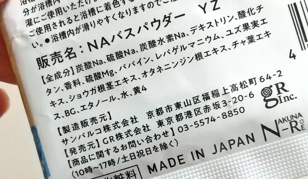 - <ゆず> 炭酸Na、硫酸Na、炭酸水素Na、デキストリン、酸化チタン、香料、硫酸Mg、パパイン、レパゲルマニウム、ユズ果実エキス、ショウガ根茎エキス、オタネニンジン根エキス、チャ葉エキス、BG、エタノール、水、黄4 <ミルク> 炭酸Na、硫酸Na、デキストリン、炭酸水素Na、酸化チタン、硫酸Mg、パパイン、レパゲルマニウム、加水分解シルク、酒粕エキス、乳タンパクエキス、チャ葉エキス、BG、エタノール、水、香料 <桃> 炭酸Na、硫酸Na、炭酸⽔素Na、デキストリン、酸化チタン、硫酸Mg、フィトステリルグルコシド/グルコシルセラミド、モモ葉エキス、モモ種子エキス、チャ葉エキス、レパゲルマニウム、パパイン、オレイン酸Na、ラウリン酸ポリグリセリルー5、BG、エタノール、水、香料、赤102 <りんご> 炭酸Na、硫酸Na、炭酸水素Na、硫酸Mg、セラミドNP、セラミドAP、セラミドEOP、フィトスフィンゴシン、レパゲルマニウム、ヒアルロン酸Na、パパイン、チャ葉エキス、リンゴ果実水、デキストリン、コレステロール、ラウロイルラクチレートNa、カルボマー、キサンタンガム、エチルヘキシルグリセリン、エタノール、水、香料、赤102、赤106 <ひのき> 炭酸Na、硫酸Na、炭酸水素Na、デキストリン、酸化チタン、硫酸Mg、セラミドNP、セラミドAP、セラミドEOP、フィトスフィンゴシン、レパゲルマニウム、ヒアルロン酸Na、パパイン、チャ葉エキス、ヒノキ油、コレステロール、ラウロイルラクチレートNa、カルボマー、キサンタンガム、エチルヘキシルグリセリン、エタノール、水、香料、黄4、緑201 <お米> 炭酸Na、硫酸Na、炭酸水素Na、酸化チタン、デキストリン、硫酸Mg、レパゲルマニウム、パパイン、コメヌカエキス、コメ発酵液、チャ葉エキス、エタノール、BG、水、香料 <みかん> 炭酸Na、硫酸Na、炭酸水素Na、酸化チタン、デキストリン、硫酸Mg、レパゲルマニウム、パパイン、ウンシュウミカン果実水、ウンシュウミカン果皮エキス、チャ葉エキス、エタノール、水、香料、黄5、赤227 <ラムネ> 炭酸Na、硫酸Na、炭酸水素Na、硫酸Mg、レパゲルマニウム、パパイン、サンザシエキス、ナツメ果実エキス、グレープフルーツ果実エキス、リンゴ果実エキス、チャ葉エキス、オレンジ果汁、レモン果汁、ライム果汁、メントール、エタノール、BG、水、香料、⻘2、⻩4 <ラベンダー> 炭酸Na、硫酸Na、炭酸水素Na、酸化チタン、デキストリン、硫酸Mg、レパゲルマニウム、パパイン、グリシン、ネムノキ樹皮エキス、ラベンダー花/葉/茎エキス、チャ葉エキス、BG、グリセリン、エタノール、水、香料、赤227、⻘2、緑201