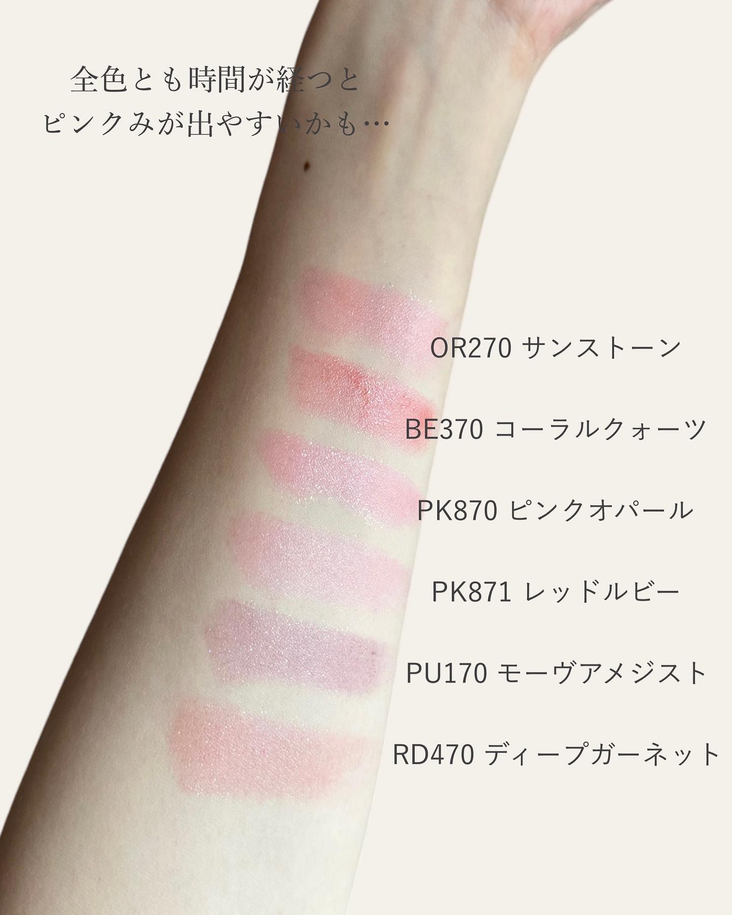 - 宝石のような輝きをまとうティントリップバーム。 唇をケアしながら、自然な血色感をプラスし、ピュアな唇へと導く。 BE370 コーラルクォーツ:カジュアルな印象のコーラル系 OR270 サンストーン:フレッシュな印象のオレンジ系 PK871 レッドルビー:キュートな印象のルビー系 PU170 モーヴアメジスト(限定色):魅惑的な印象のモーヴレッド系 RD470 ディープガーネット(限定色):熟した果実のようなレッド系
