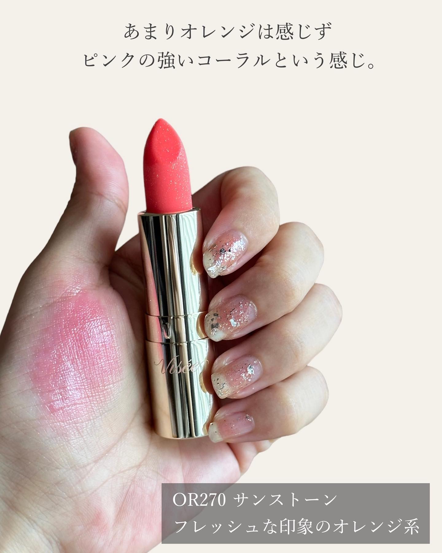表面に3色のパール 〈シルバー・ゴールド・グリーン〉が吹きつけてあるティントセラム。 表面のパールが可愛いんだけど、中にはパールがないです🥲 コーラルクォーツは血色感をあたえる、肌なじみのいいコーラル。 カジュアルな印象に。ナチュラルな発色で使いやすかったです🫶 可愛い色だし、塗りやすくしっとりしてよかったんだけど、中にもパールがあるとよかったな。