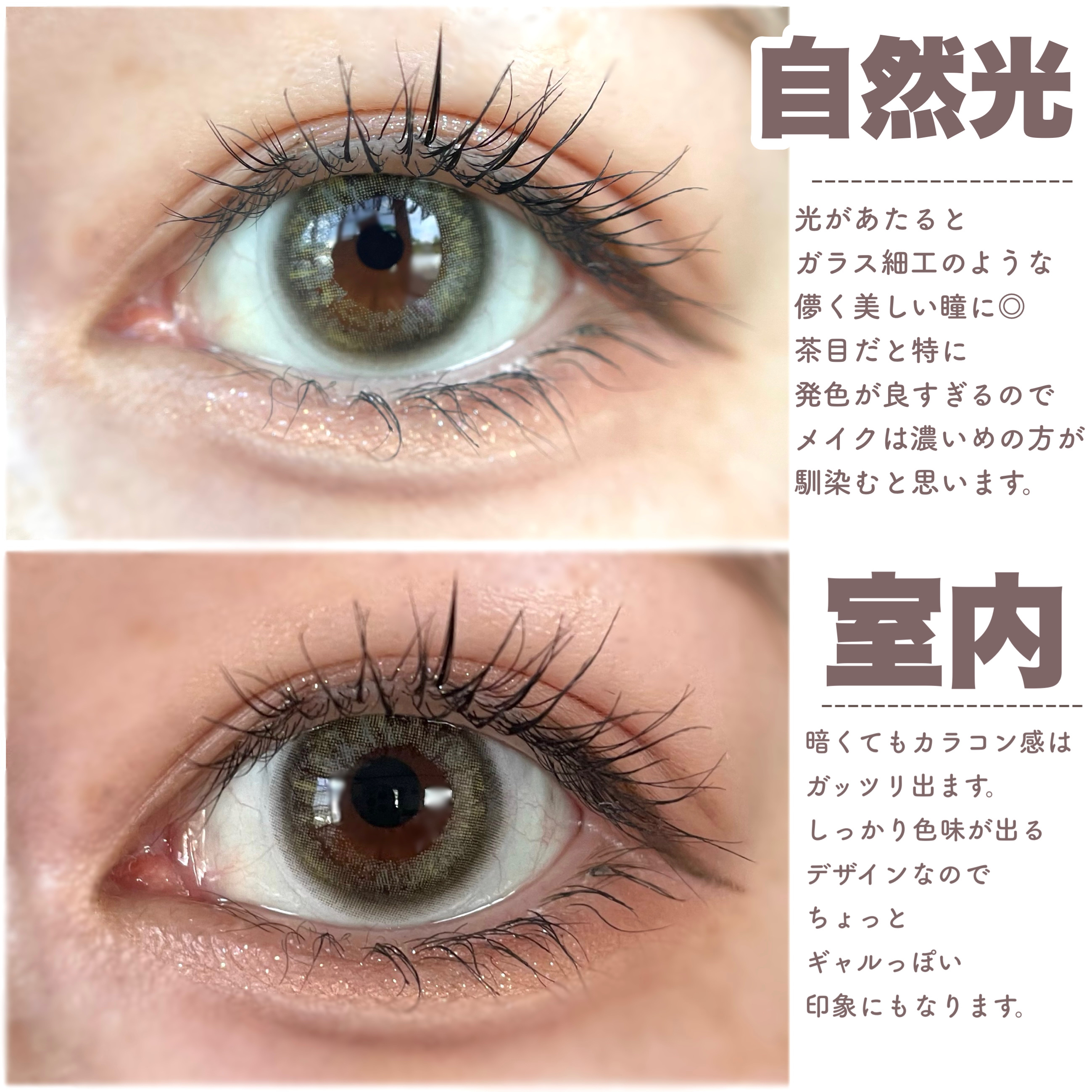 着色直径13.0mmですが、周りがぼやっとしているので裸眼より若干大きいかなぁ??くらいの自然なサイズ感👌🏻 なのに瞳にキラキラっと光が入ってくる感じがあって、目の輝きが全然違うんです✨ 元の瞳がそのまま少し大きくなった感覚で、これはもうほぼ裸眼🤔笑 着色直径13.5mmで、上二つと比べると少し大きめですが、外側がとっっても馴染みやすくて私の体感的には着色直径13.2くらいのイメージ🤔💭 つけた感じは、メルティベアを少し大きくした感じなのでとてもナチュラル✊🏻