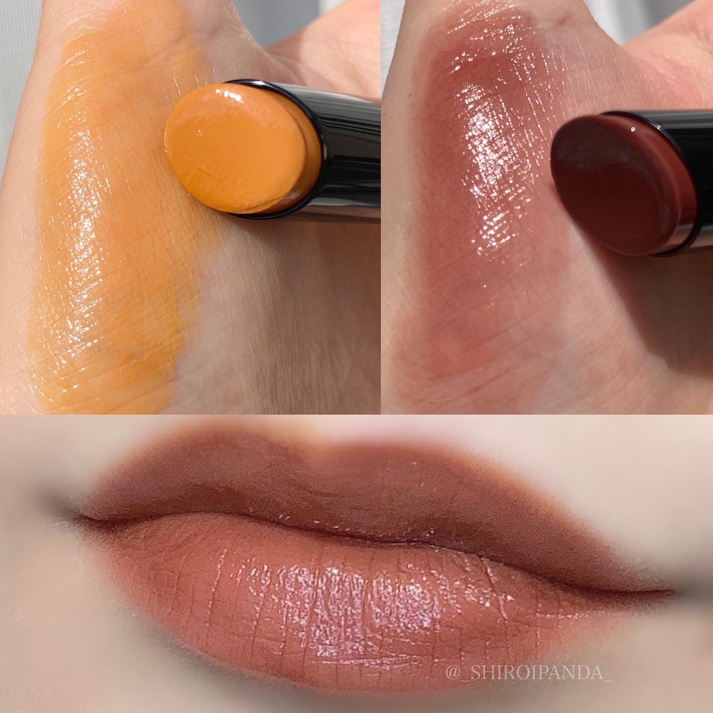 思ったより赤みのあるピンクで血色感があってつけやすくて可愛い🌸思ったより青みは強くなくコーラルっぽさも感じるのでPC関係なくナチュラルに使えそう☺️ モーヴ感強くて顔色悪くなるかな?と思ったけど塗ってみたらマイルドなオレンジブラウンのように発色した🍊ブラウンリップほど濃くないのでブルベさんでも使えるニュアンスブラウン🤎 とにかくちゅるるんとした唇になれるリップ🥹 食事をしたら取れちゃう感じだけど、塗り直しすれば問題なし🙆♀️ とにかくカラーとパケがかわいい🧚