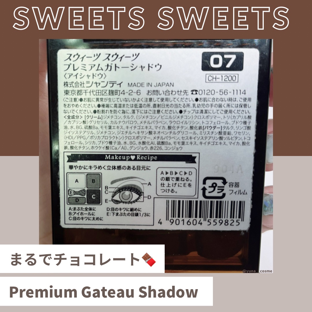 めちゃ可愛いの見つけた! 「スウィーツ スウィーツ」というブランドのアイシャドウ♡ もはやブランド名からかわいい…。 アイシャドウの名前は「プレミアムガトーシャドウ」ということは、深みチョコをイメージしているんだろうか? 私が使ったカラーの「04 ベリーブレッド」はこっくり深みのチョコカラーの締め色と、ココアチョコみたいな中間色がセットになっているよ。