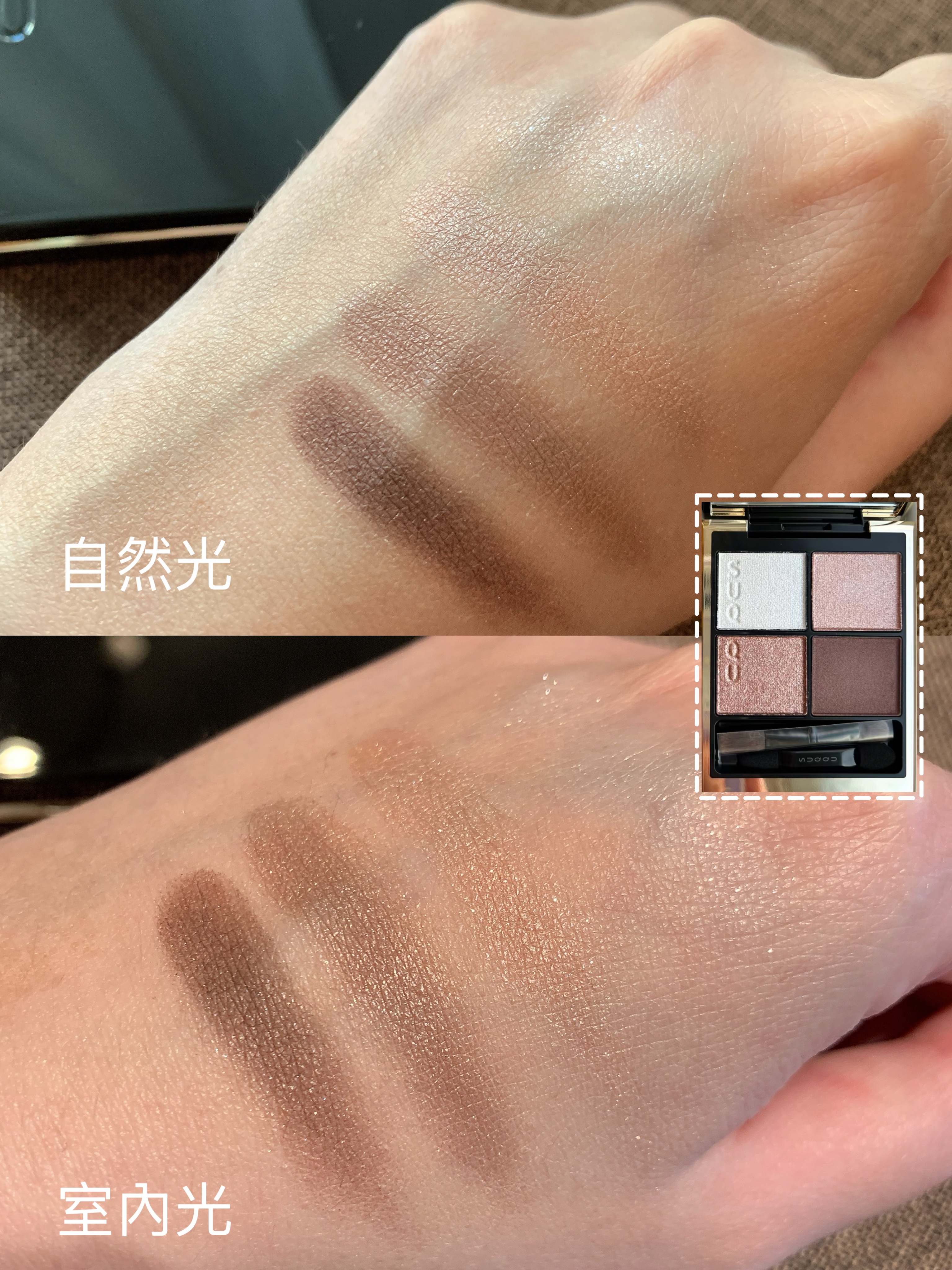 艶やかに咲く春の花々や景色が描かれた '花屏風'の色彩に着想されたSUQQUの春コレクション 大人のピンクベージュパレット。左上: サテンベージュ(上品なツヤ感) 薄膜で密着し、重ねてもムラにならず、ラメ落ちしにくい。パウダーレスな質感で肌と一体化。