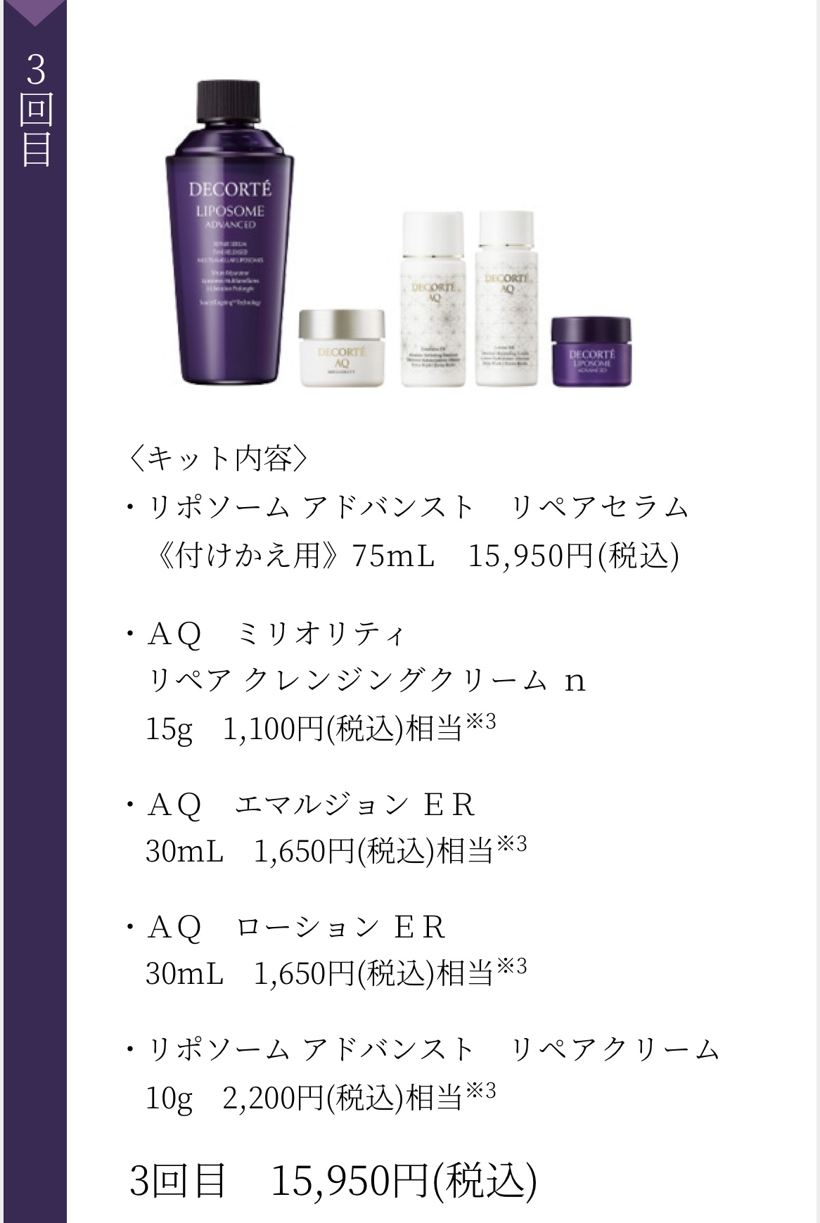 リポソーム アドバンスト リペアクリーム 50g(11,000円現品)・リポソーム アドバンスト リペアセラム 12mL(3,000円相当)・リポソーム アドバンスト リペアアイセラム 8mL(3,300円相当) 約17,300円相当が→11,000円になるので、6,300円ほどお得になります🙌🏻 定期購入が実質1番お得なのかもしれませんが、定期購入に縛られたくない人にとって、このパープルリボンセットが年間で最もお得にリポソームシリーズが購入できるキャンペーンなんです!✨
