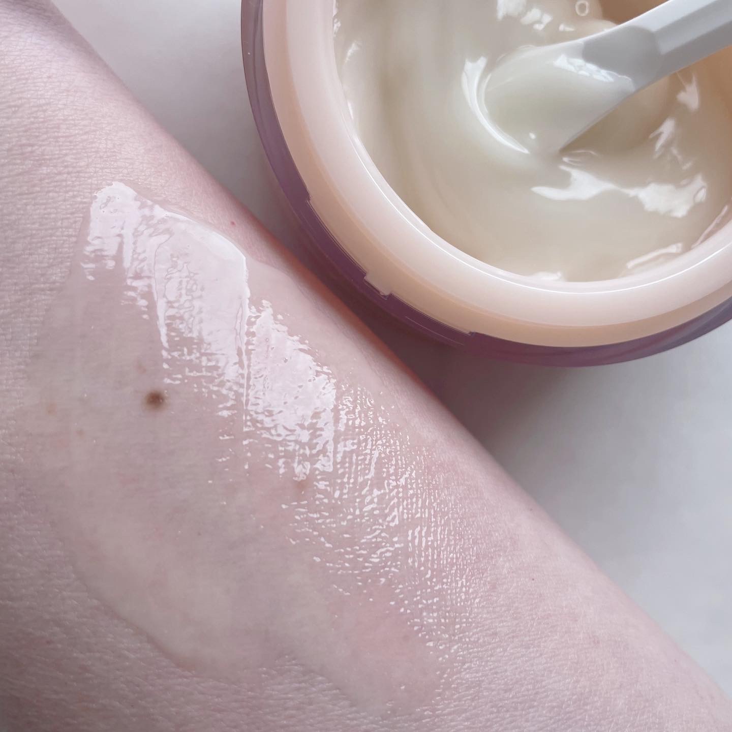 見た目はなめらかなクリームなのですが、手にすると糸のように伸びます♬ 言葉で表すなら、まさに「びよーん」w 納豆をも連想させるくらいの伸びなのですが、肌になじませるように伸ばすともう伸び終了。 ややベタつきもあるものの軽くマッサージをプラスすると気にならなくなります。
