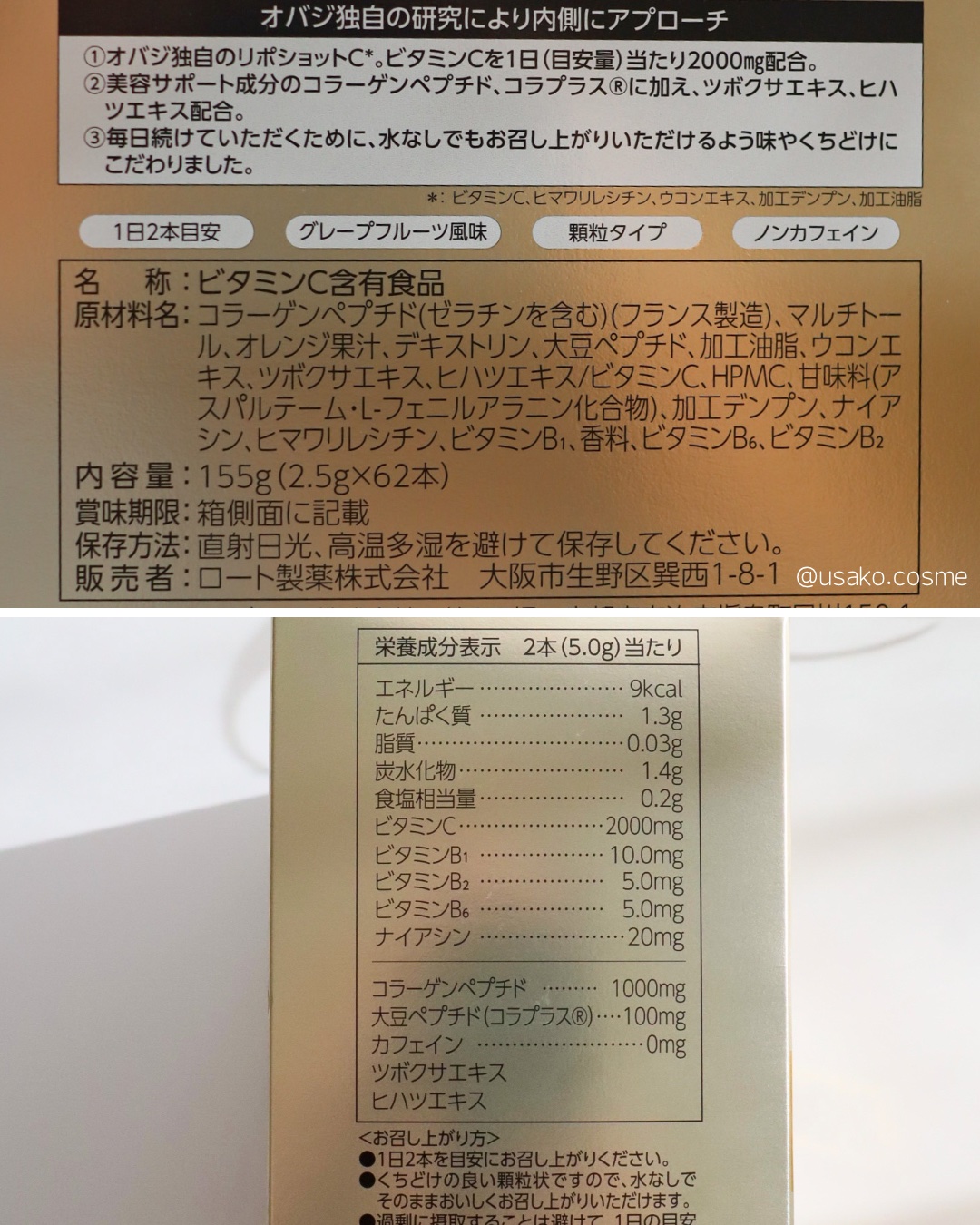 - オバジが提案する飲む“ビタミンC”。オリジナルのリポショットC*を配合し、すばやく届けることを目指し開発した顆粒タイプ。内側からハリとうるおいのある毎日を応援し、透き通るような美しさをサポートします。 <オバジ独自の研究により内側にアプローチ> 1. オバジ独自のリポショットC*。ビタミンCを1日(目安量)当たり2000mg配合。 2. 美容サポート成分のコラーゲンペプチド、コラプラス®に加え、ツボクサエキス、ヒハツエキス配合。 3. 毎日続けていただくために、水なしでもお召し上がりいただけるよう味やくちどけにこだわりました。 ・グレープフルーツ風味 ・顆粒タイプ ・ノンカフェイン *ビタミンC、ヒマワリレシチン、ウコンエキス、加工デンプン、加工油脂