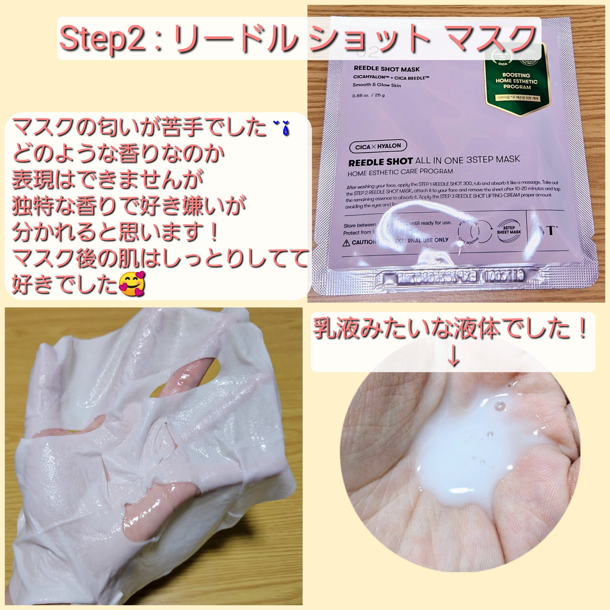 - <リードルショットオールインワン3ステップマスク> 水、DPG、グリセリン、ナイアシンアミド、BG、マカデミア種子油、1,2-ヘキサンジオール、パルミチン酸エチルヘキシル、シリカ、(アクリル酸Na/アクリロイルジメチルタウリンNa)コポリマー、ポリイソブテン、グリセレス-26、エチルヘキシルグリセリン、カプリリルグリコール、アデノシン、ポリアクリル酸Na、ツボクサエキス、ヒアルロン酸Na、(カプリリル/カプリル)グルコシド、オレイン酸ソルビタン、キサンタンガム、プロポリスエキス、アシアチコシド、マデカッソシド、マデカシン酸、アシアチン酸、グリシン、セリン、グルタミン酸、アスパラギン酸、ロイシン、アラニン、リシン、アルギニン、チロシン、フェニルアラニン、トレオニン、プロリン、バリン、イソロイシン、ヒスチジン、メチオニン、システイン、エチルヘキサン酸セチル、ステアリン酸グリセリル、ジメチコン、ステアリン酸PEG-100、ポリソルベート60、ベタイン、ホホバ種子油、ヒマワリ種子油、シア脂、(アクリロイルジメチルタウリンアンモニウム/VP)コポリマー、パルミチン酸、ステアリン酸、スクワラン、酢酸トコフェロール、アラントイン、キシリチルグルコシド、無水キシリトール、EDTA-2Na、キシリトール、パンテノール、グルコース、ラウリン酸ポリグリセリル-10、パルミトイルペンタペプチド-4、パルミトイルトリペプチド-1、ヘキサペプチド-9、アセチルヘキサペプチド-8、トリペプチド-1、トリペプチド-1銅、ラウロイルグルタミン酸ジ(オクチルドデシル/フィトステリル/ベヘニル)、アブラナステロールズ、コレステロール、水添レシチン、ヤシ油、ヒトサイタイ間葉幹細胞順化培養液エキス、ステアロイルグルタミン酸Na、カルボマー、トロメタミン、コラーゲンエキス、加水分解エラスチン、レウコノストック/ダイコン根発酵液、加水分解ヒアルロン酸、DNA、香料