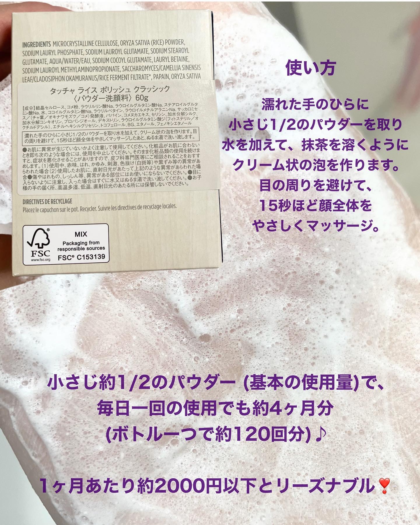 タッチャライスポリッシュクラッシック/ジェントル米ぬかと米粉を主成分とした弱酸性の酵素洗顔パウダー!日本の伝統的な美容法に着想を得て作られたタッチャのベストセラーアイテムです。不要な角質や汚れを除去しなめらかな肌に導いてくれます。濡れた手に小...