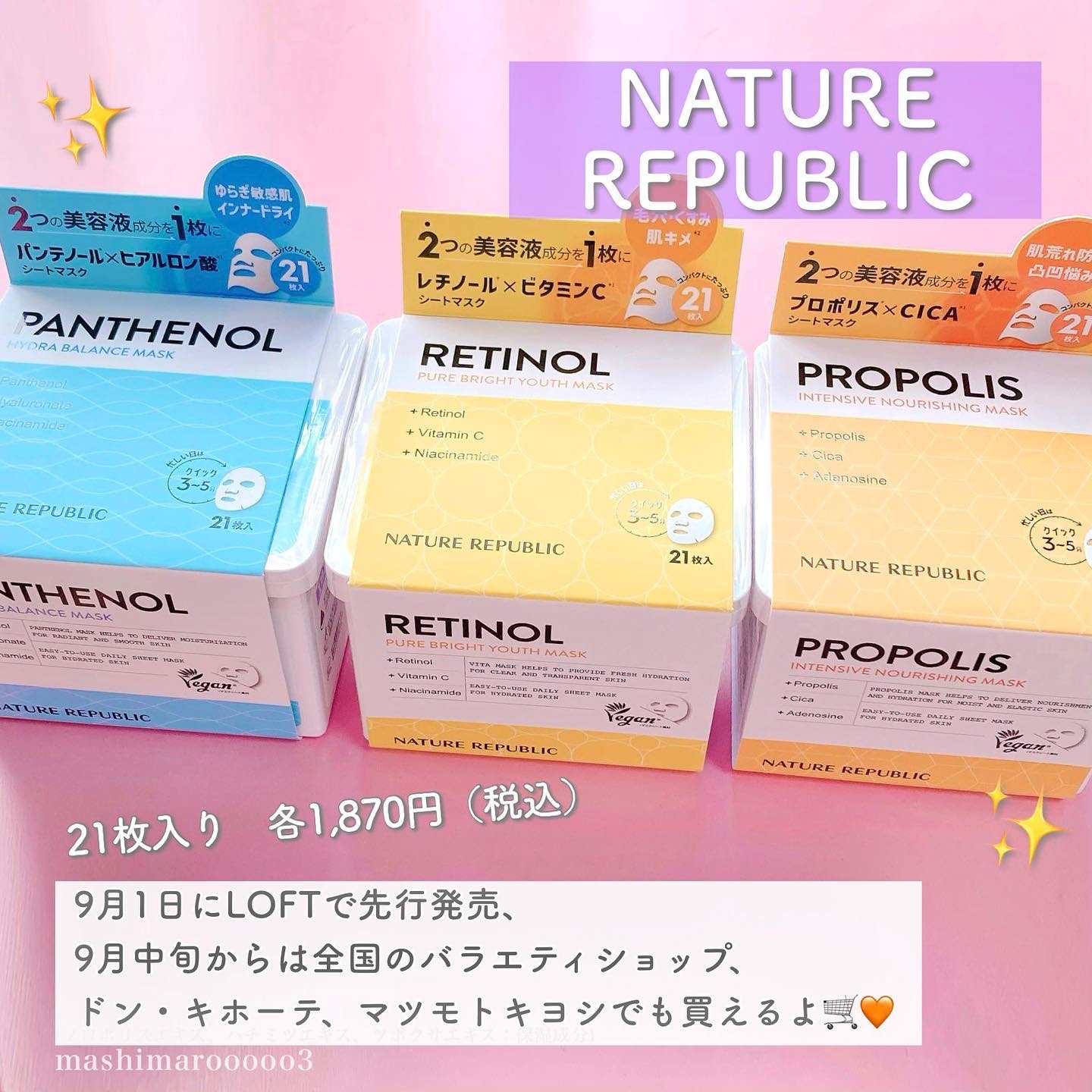 NATUREREPUBLICレチノールピュアブライトユースシートマスク パンテノールハイドラバランスシートマスクプロポリスインテンシブナリシングシートマスク内容量▷▶21枚入り販売価格▶各1,870円(税込)𓈒𓏸𓐍𓂃𓈒𓏸𓂃◌𓈒𓐍𓈒𓈒𓏸𓐍𓂃𓈒𓏸...