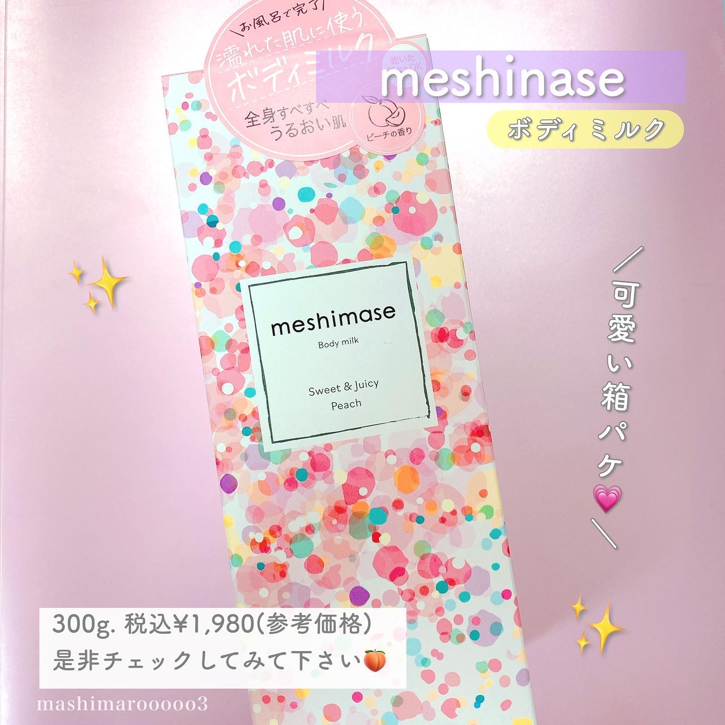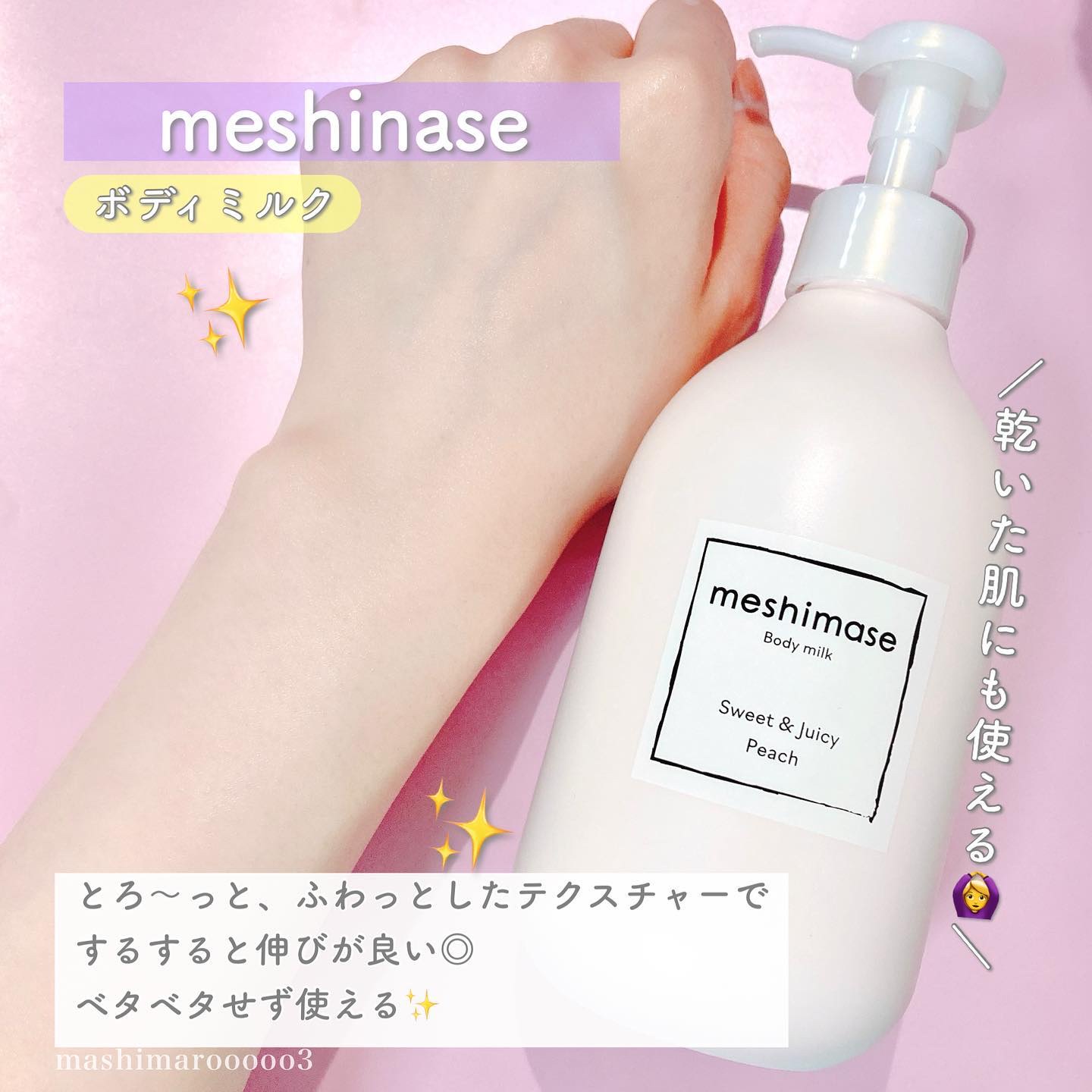 meshimaseボディミルクペアー桃の香りの方を使ってみてよかったのでこっちも購入してみました✨お風呂上がりに濡れたままで塗れるボディミルク🪄乾いた肌にも塗れるので2wayで使用できます🥹私は肌が乾燥しやすいのでこのボディミルクをお風呂上が...