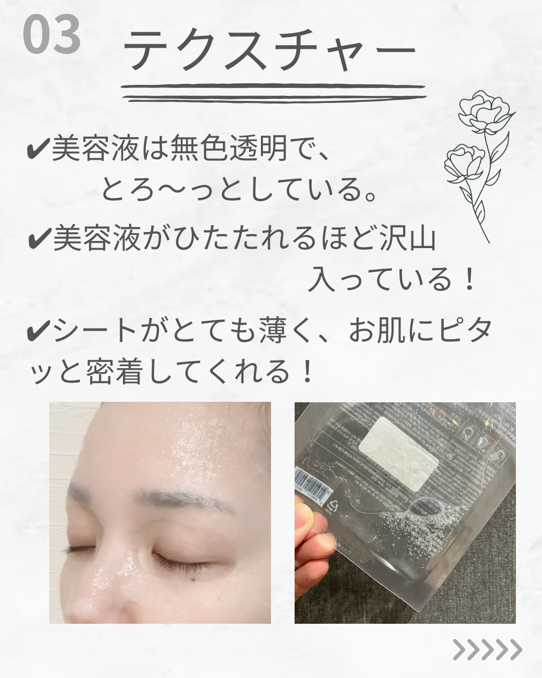 | 美容液が沢山入っていて、余るくらいでした!パックの上から余った美容液を更に重ね付けをしています🌿それでも余るので、全身に使用しました👌 | 詳細を見る | ||