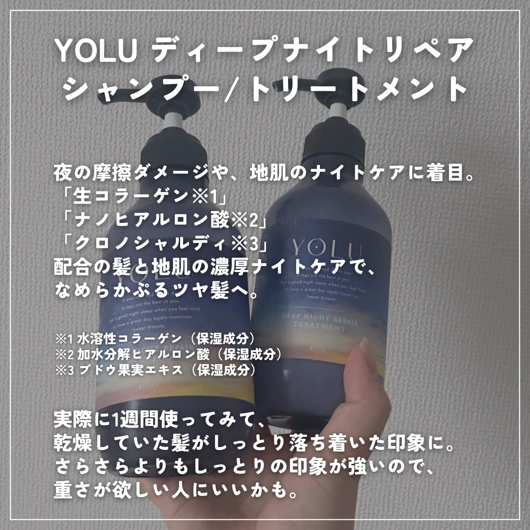 YOLU▷ディープナイトリペアシャンプー泡立ち◎で洗いあがりはきしまずしっとり✨️▷ディープナイトリペアトリートメントなめらかなテクスチャーで髪になじませやすく、洗いあがりはしっとりなめらか✨️ドライヤー後はまとまりが良くなりしっとりサラ...
