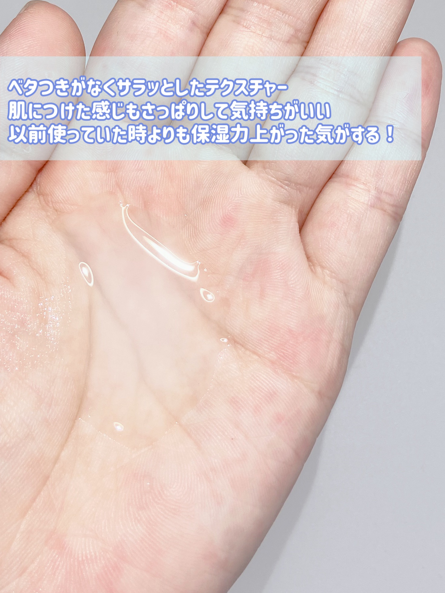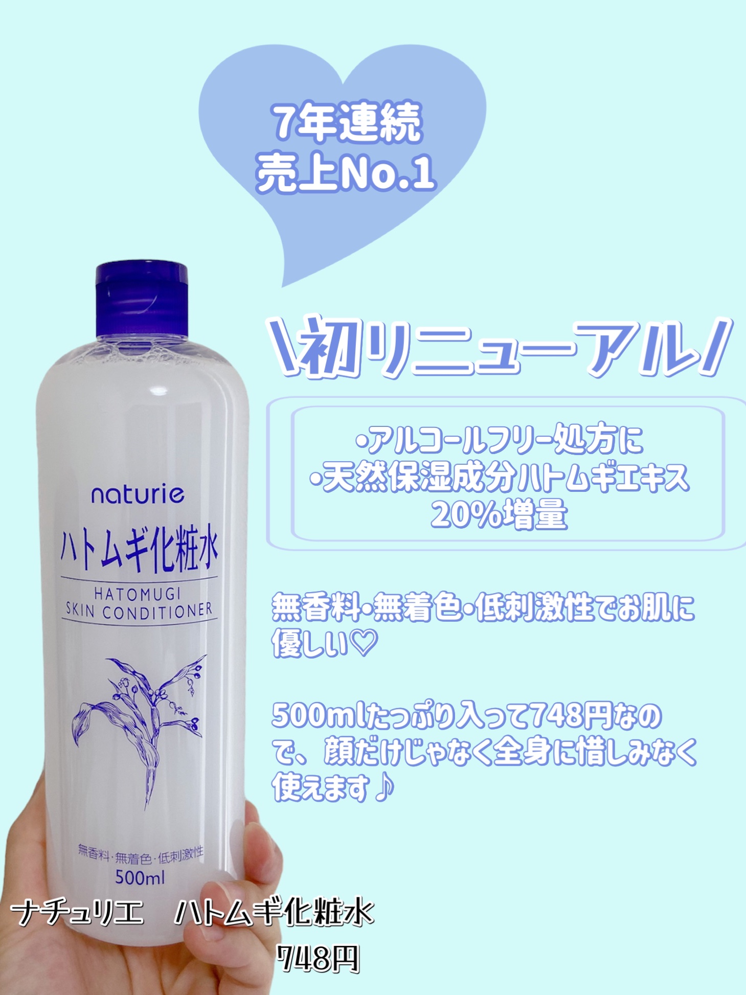 ハトムギエキス20%増量で保湿力UP →天然植物由来の保湿成分ハトムギエキスを従来品より20%増量 アルコールフリーに →毎日快適に使いやすいアルコールフリーになった テクスチャーはみずみずしくベタつかない 肌にスーッと馴染んでくれる