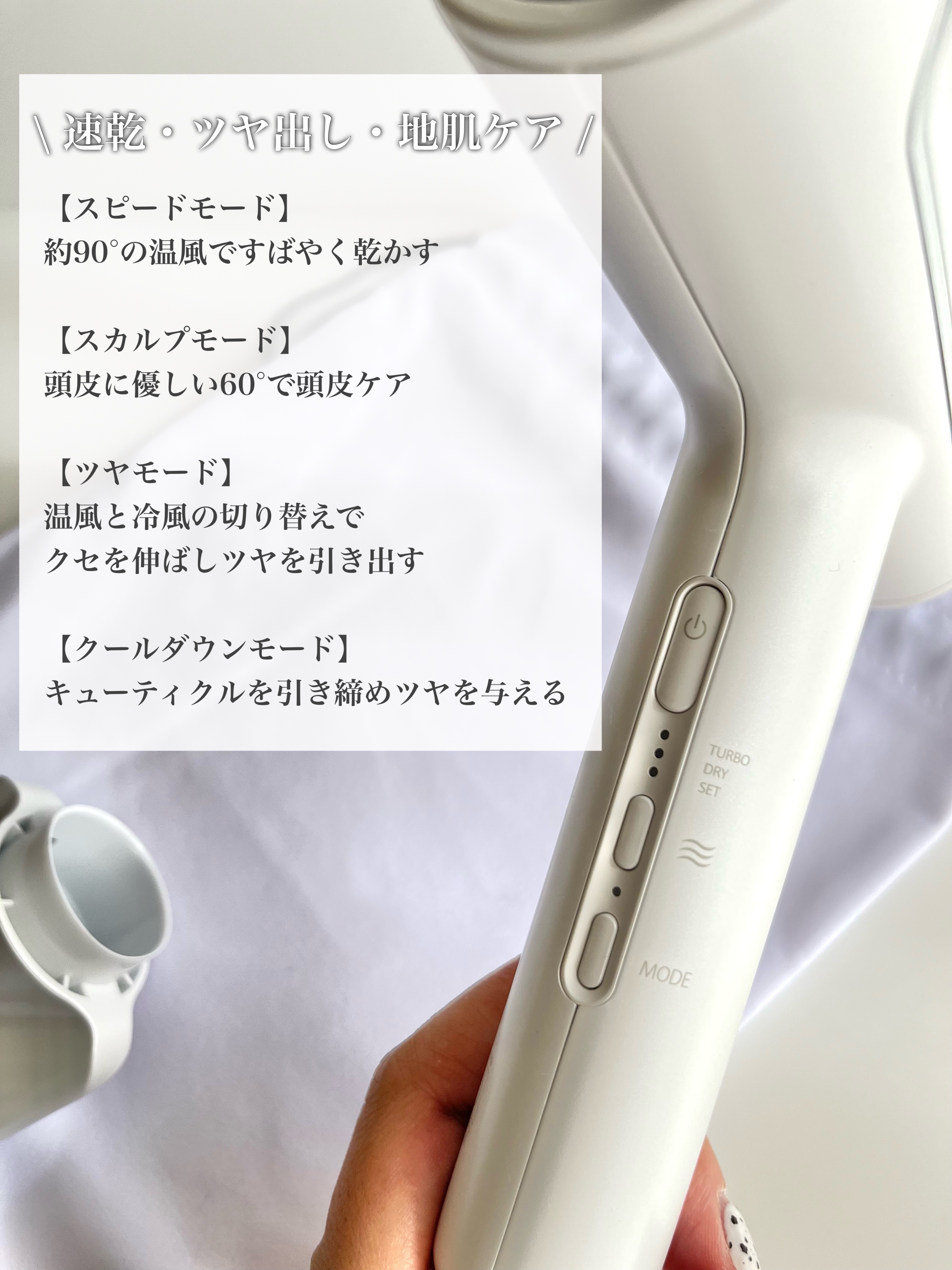 270gというかなり軽量なドライヤー! なので腕が疲れにくく快適✨ こんな軽いのに風量がかなり強くてびっくり😳 このドライヤーはとにかく風量が強め! 最後まで乾かしやすい! モードは4つあり ①スピードで髪全体を乾かして ②スカルプで頭皮と地肌をしっかり乾かし ③ツヤで整えて ④クールダウンでキューティクルを引き締める✨