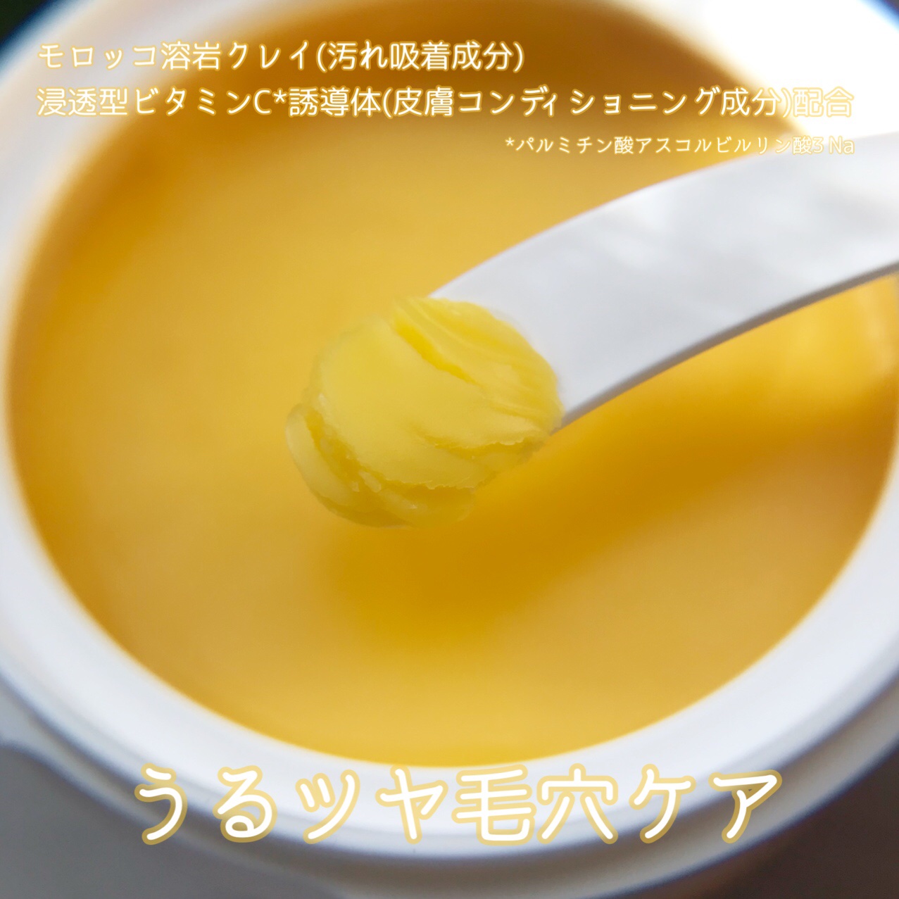 - <95g> パルミチン酸エチルヘキシル、トリ(カプリル酸/カプリン酸)グリセリル、トリイソステアリン酸PEG-20グリセリル、合成ワックス、イソステアリン酸PEG-20グリセリル、水、アスコルビルグルコシド、パルミチン酸アスコルビルリン酸3Na、テトラヘキシルデカン酸アスコルビル、モロッコ溶岩クレイ、ベントナイト、プロテアーゼ、リパーゼ、セラミドNP、セラミドEOP、セラミドAP、ユズ果皮油、レモン果実エキス、マンダリンオレンジ果皮油、ビターオレンジ花油、グリチルリチン酸2K、トコフェロール、酢酸トコフェロール、アルガニアスピノサ核油、ダイズ油、シア脂、プラセンタエキス、水溶性コラーゲン、加水分解コラーゲン、ヒアルロン酸ヒドロキシプロピルトリモニウム、ビルベリー葉エキス、リンゴ果実エキス、ザクロ果実エキス、コメヌカエキス、カンゾウ根エキス、カミツレ花エキス、ウルチカジオイカエキス、ハマメリス葉エキス、乳酸桿菌/セイヨウナシ果汁発酵液、ゼニアオイ花エキス、スクワラン、ニンジン根エキス、ラウロイルラクチレートNa、BG、グリセリン、酢、温泉水、フィトスフィンゴシン、リン酸、カルボマー、キサンタンガム、フェノキシエタノール、マルトデキストリン、リン酸Na、スブチリシン、コレステロール、ペンチレングリコール、香料 <120g> パルミチン酸エチルヘキシル、トリ(カプリル酸/カプリン酸)グリセリル、トリイソステアリン酸PEG-20グリセリル、合成ワックス、イソステアリン酸PEG-20グリセリル、水、アスコルビルグルコシド、パルミチン酸アスコルビルリン酸3Na、テトラヘキシルデカン酸アスコルビル、モロッコ溶岩クレイ、ベントナイト、プロテアーゼ、リパーゼ、セラミドNP、セラミドEOP、セラミドAP、ユズ果皮油、レモン果実エキス、マンダリンオレンジ果皮油、ビターオレンジ花油、グリチルリチン酸2K、トコフェロール、酢酸トコフェロール、アルガニアスピノサ核油、ダイズ油、シア脂、プラセンタエキス、水溶性コラーゲン、加水分解コラーゲン、ヒアルロン酸ヒドロキシプロピルトリモニウム、ビルベリー葉エキス、リンゴ果実エキス、ザクロ果実エキス、コメヌカエキス、カンゾウ根エキス、カミツレ花エキス、ウルチカジオイカエキス、ハマメリス葉エキス、乳酸桿菌/セイヨウナシ果汁発酵液、ゼニアオイ花エキス、スクワラン、ニンジン根エキス、ラウロイルラクチレートNa、BG、グリセリン、酢、温泉水、フィトスフィンゴシン、リン酸、カルボマー、キサンタンガム、フェノキシエタノール、マルトデキストリン、リン酸Na、スブチリシン、コレステロール、ペンチレングリコール、香料