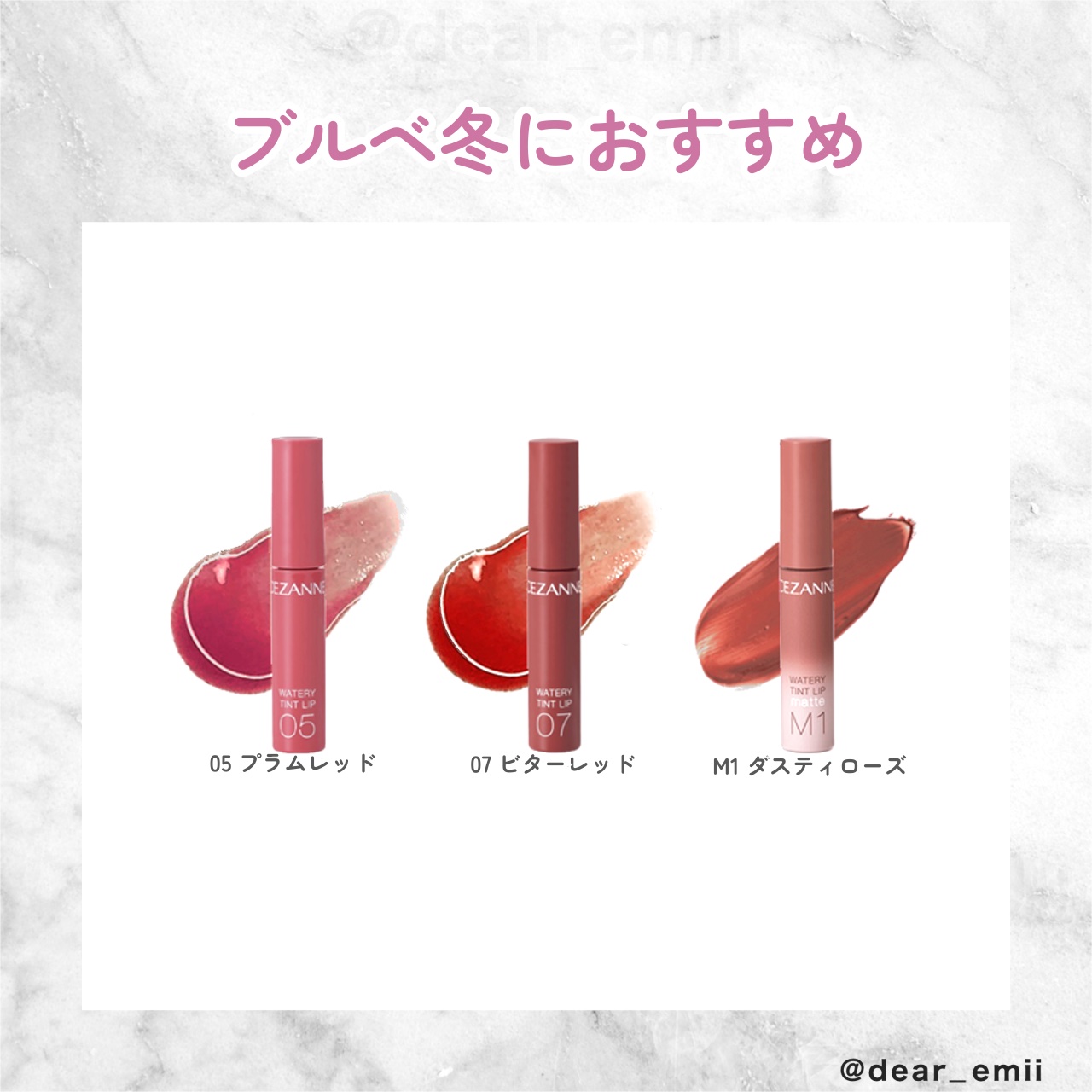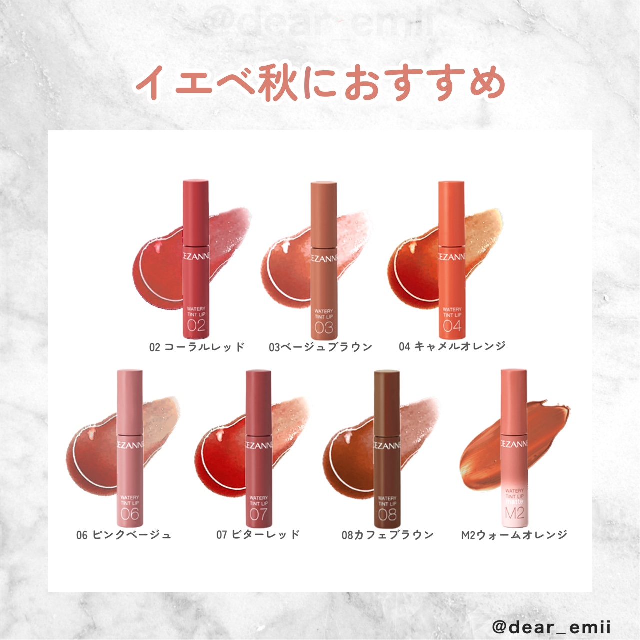 みずみずしい塗り心地のセザンヌ ウォータリーティントシリーズ、全10色(ツヤタイプ9色、ソフトマットタイプ1色)をレビューしました! 1本660円なのでいつもと違ったカラーも試しやすいですよ✨かさばらないので持ち運びにも◎ 残念なことにウォータリーティントリップ08カフェブラウンとマットM1ダスティローズが春の廃盤対象に。気になっている方はお早めにご購入ください⚠️