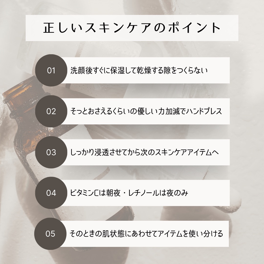 私の肌質・普通肌〜混合肌・コンディションによって頬と目元が乾燥する・鈍感肌で刺激には強め・鉱物油(ミネラルオイル)のみニキビができやすい ☀️朝のスキンケアSTEP①洗顔②導入美容液③化粧水④ビタミンC美容液⑤乳液⑥クリーム(コスメとの相性や肌状態によっては省略) 🌙夜のスキンケアSTEP①メイク落とし②洗顔③導入美容液④化粧水⑤ビタミンC美容液⑥レチノール美容液⑦オイル美容液⑧乳液⑨クリーム ✅正しいスキンケアのポイント・肌はとにかくこすらないのが大切!洗顔は泡で優しく撫でるように、ハンドプレスは軽く抑える程度の力加減がベスト・洗顔後は乾燥しやすいのですぐに保湿・前のスキンケアアイテムが浸透してから次のステップへ肌がひんやりしたなと感じられてから次のアイテムを使うと◎放置しすぎても乾燥してしまうので要注意・レチノールは肌が紫外線に弱くなるので夜のみ使う
