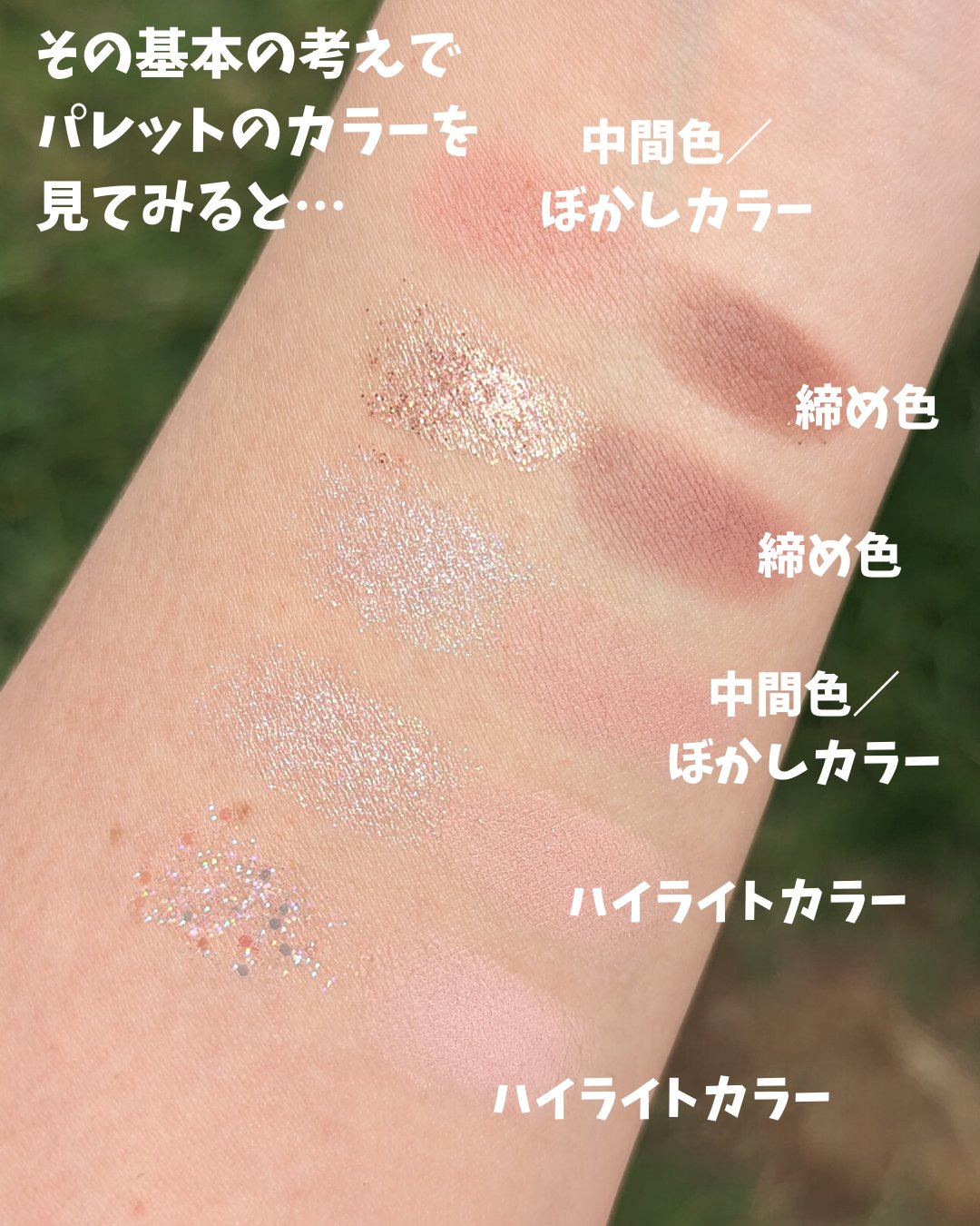 マットの発色をご覧ください。 マットでここまで発色するのって、珍しい。 特にパープル系のマットは、作るのが難しいらしく、ハイブランドでも発色がよくブレンドしやすいマットパープルを作るのに苦労するそう。 ですがこちらのaztkのマットパープルは、一塗りですんごい発色。 しっとりしているわけではないのですが、しっかり密着してくれる感じもします。 逆にパール系は少し発色優しめかな?と思いますが、ニュアンス的に使う分には問題なし。 ラメはギラギラのラメではなくチラチララメで、とっても上品。 いろんなシャドウと組み合わせて無限大にアイメイクが楽しめそうです。