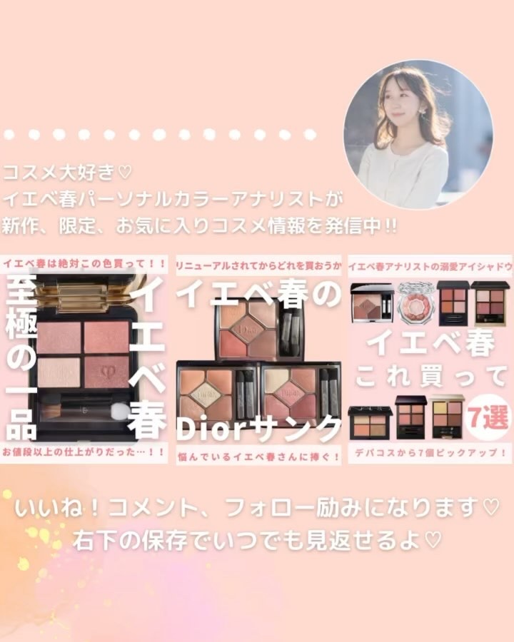 ルナソルのピンクはラメ感控えめなのでオフィスメイクにおすすめ🙆🏻♀️✨ CHANELはかなり万能だと思っていて、柔らかく仕上げればイエベ春の私ももちろんハマるし✨ ブランドごとにもちろん特徴がありますし、ピンクといってもパレットによって仕上がりはさまざま!