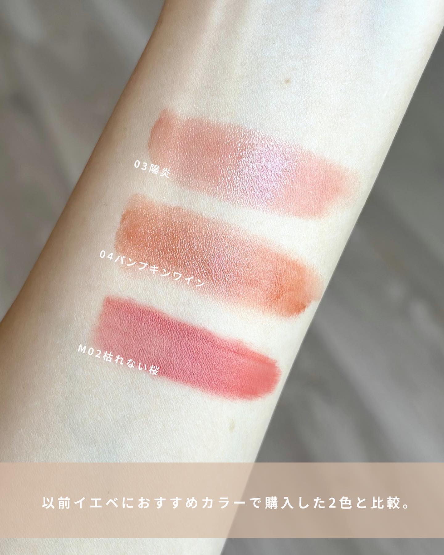 全てベージュベースになっている 肌馴染みの良いリップ。 シアーな仕上がりでリップトリートメント としても使えちゃうところも良い! スウォッチは何度もぐりぐりぬって この発色なのでそんなにパソカも気にしなくて良さそう❤️ SD04や、SD02は明るさもあるピンクなので 春の季節にもぴったりなイチオシカラー🌸 リップ自体も細くてスマートで 小さめバッグにも入れやすいよ👜