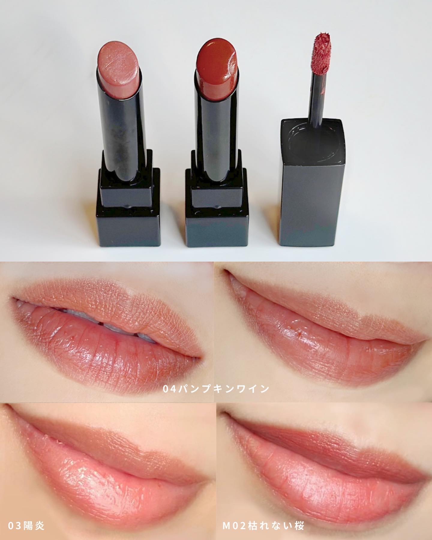 滑らかな塗り心地で高密着・高保湿、色持ちの良いリップモンスター👾 02 ピンクバナナ(春)▶︎ほんのり黄み寄りの柔らかナチュラルピンク 04 パンプキンワイン(秋)▶︎黄みしっかりこっくりテラコッタブラウン