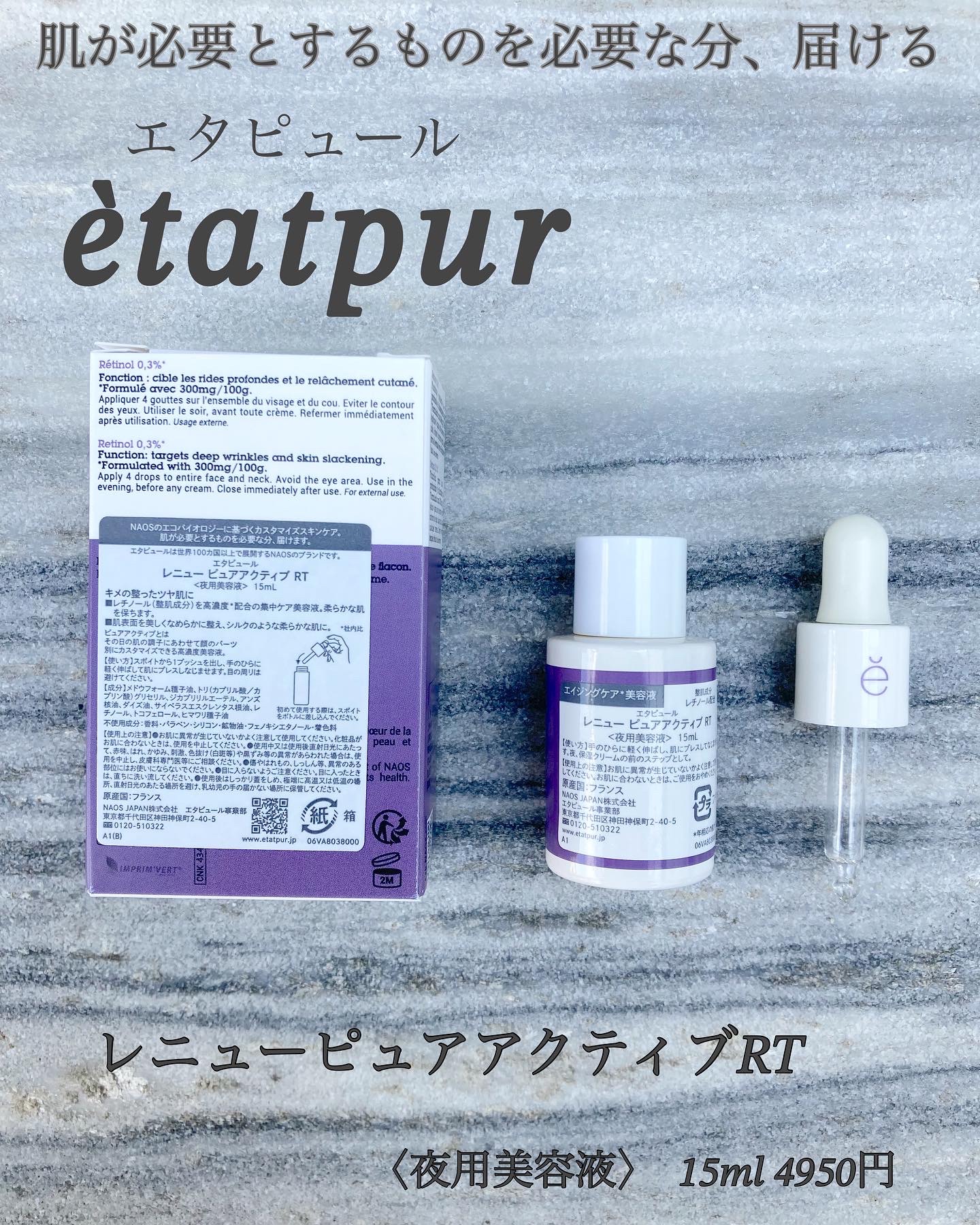 エタピュール レニューピュアアクティブRTはレチノール(※整肌成分)を0.3%配合! 整肌サイクルを整え、なめらかで輝きのある肌に導きます✨ 濃厚だけれどもさらっとしていて馴染みの良いオイルで、 原料臭?がほんの少しだけしますが、ほぼ無香。 特に荒れることなく2週間使用できています。 私の個人的な推しポイントは容量! 15mlとちっちゃなサイズなんです。 つまり、成分が劣化する前に使い切れる!😉 お肌の調子も月ごとに刻々と変わっていくので、 それに購入サイクルを合わせられるのはありがたいです🩷
