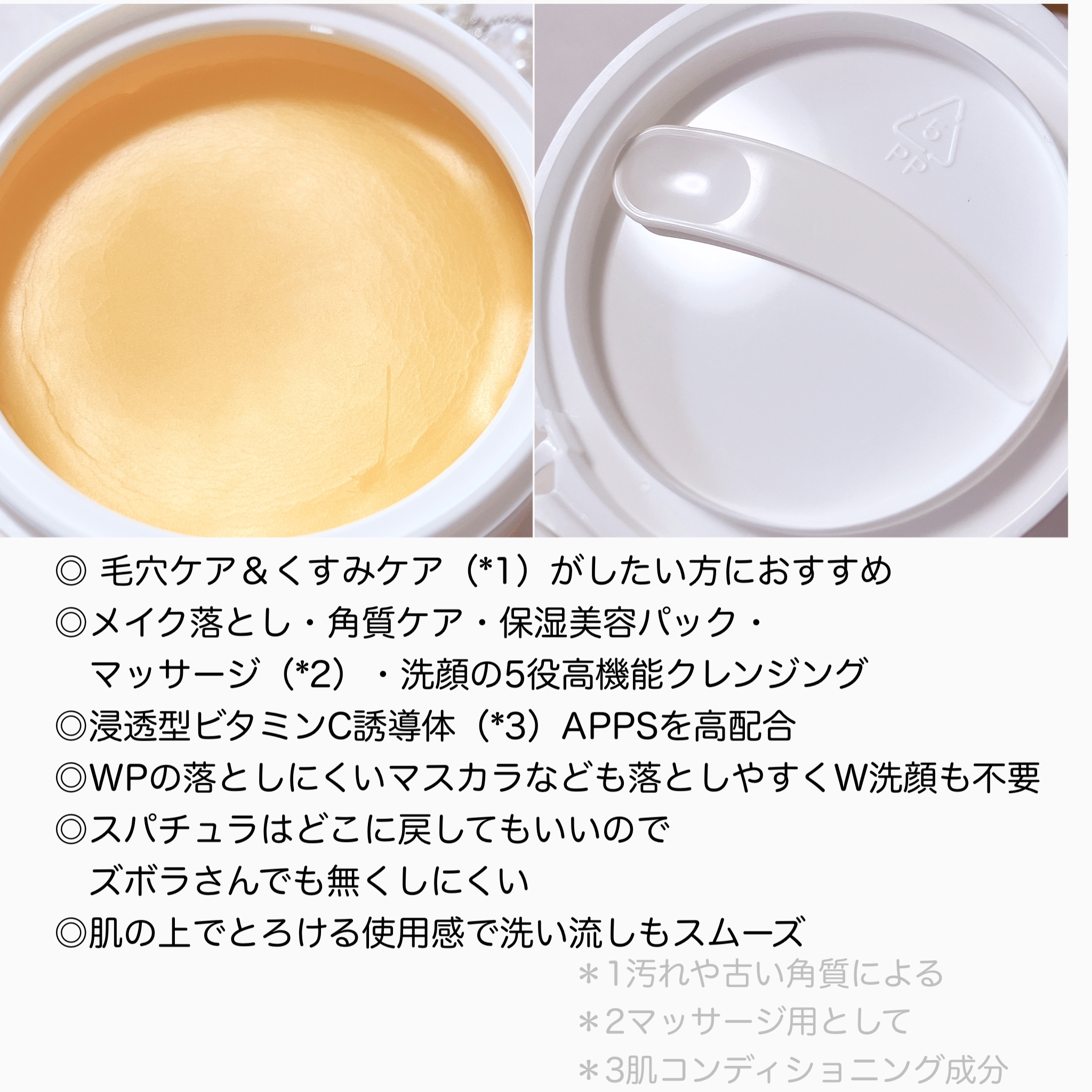 - クレイ*1×浸透型*2ビタミンC誘導体【APPS】*3配合で、毛穴ケアと同時に透明感ケアを叶える濃密すっきりクレンジングバーム。この1つでクレンジング・洗顔・角質ケア・マッサージケア・保湿美容パックの5つの機能を兼ね備え、毛穴のざらつき・くすみ*4・黒ずみ*4も、すっきり落とします。 肌に乗せるとバターのようにとろけてオイル状に変化するテクスチャーで肌への摩擦が少なく、顔全体をマッサージもすることができます。しっかりメイクや毛穴のガンコな汚れにもとろけるように馴染み、クレイ*1×ビタミン*3の力で酸化皮脂や古い角質、黒ずみ汚れなどの蓄積した老廃物を優しく吸着除去します。浸透型*2ビタミンC誘導体【APPS】*3だけでなく、3種のヒト型セラミド*3やプラセンタ*3、コラーゲン*3、アルガンオイル*3などの天然植物エキスなどの高保湿エッセンスを配合。使用後はこわばった肌をやさしく潤わせながら、ザラつき・テカリもすっきりクリアに。使い続けることで毛穴の目立たないメイクのりのよい健康的な素肌へ導きます。W洗顔不要です。リラックスシトラスの香り。 *1汚れ吸着成分 *2角質層まで *3保湿成分 *4古い角質による