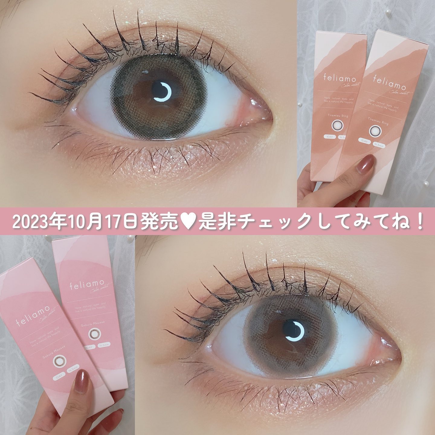 - ※2025年6月以降、商品パッケージ裏面・側面の一部表記を順次変更いたします。尚、これにかかる商品の交換・返品は承っておりません。 どんな瞬間にも溶け込む誰からも愛される瞳へ feliamoの由来は felice amore~幸せな愛~ 瞳から愛されオーラを放つ好印象レンズで女性らしさと品を演出。 オンも、オフも、特別な日も。 どんな場面にも溶け込むレンズラインナップで誰からも愛される瞳に。 UV CUT Feature1 肌や瞳に有害といわれ、白内障などの眼病を引き起こす危険性のある紫外線を99%カットします。(UV-A波75%、UV-B波99%カット) イオン性 Feature1 水分を多く含み酸素を通しやすいため瞳にやさしい使い心地で、快適な装用感です。 高含水 Feature1 水分が多く含むやわらかい素材で、快適なつけ心地です。 レンズ構造 Feature1 まぶた側に着色剤を内包しているため、角膜に色素が触れることがない構造を採用しています。 レンズ形状 Feature1 フチを丸みのある形状にすることで自然な装用感を実現しました。 ※装用感には個人差があります。 カラーコンタクトレンズの不適正使用による眼障害の危険性等などがあります。 ●コンタクトレンズは高度管理医療機器です。不十分な洗浄・消毒など不適切なケアや、長時間・交換期間を超えた装用により、アレルギー性結膜炎、角膜感染症、角膜潰瘍等の重篤な眼障害が発生する危険性があります ●ご使用前に取扱説明書を確認してください 使用上の留意事項 ●眼科医院等を受診してからお求めください ●眼に異常を感じたら直ちにレンズ使用を中止し、お近くの眼科等で診察を受けてください ●医師の指示にしたがってご使用ください ●コンタクトレンズを装用する場合、自覚症状がなくても、眼科医院等での定期検査を受けてください ●レンズに不具合がある場合は使用しないでください