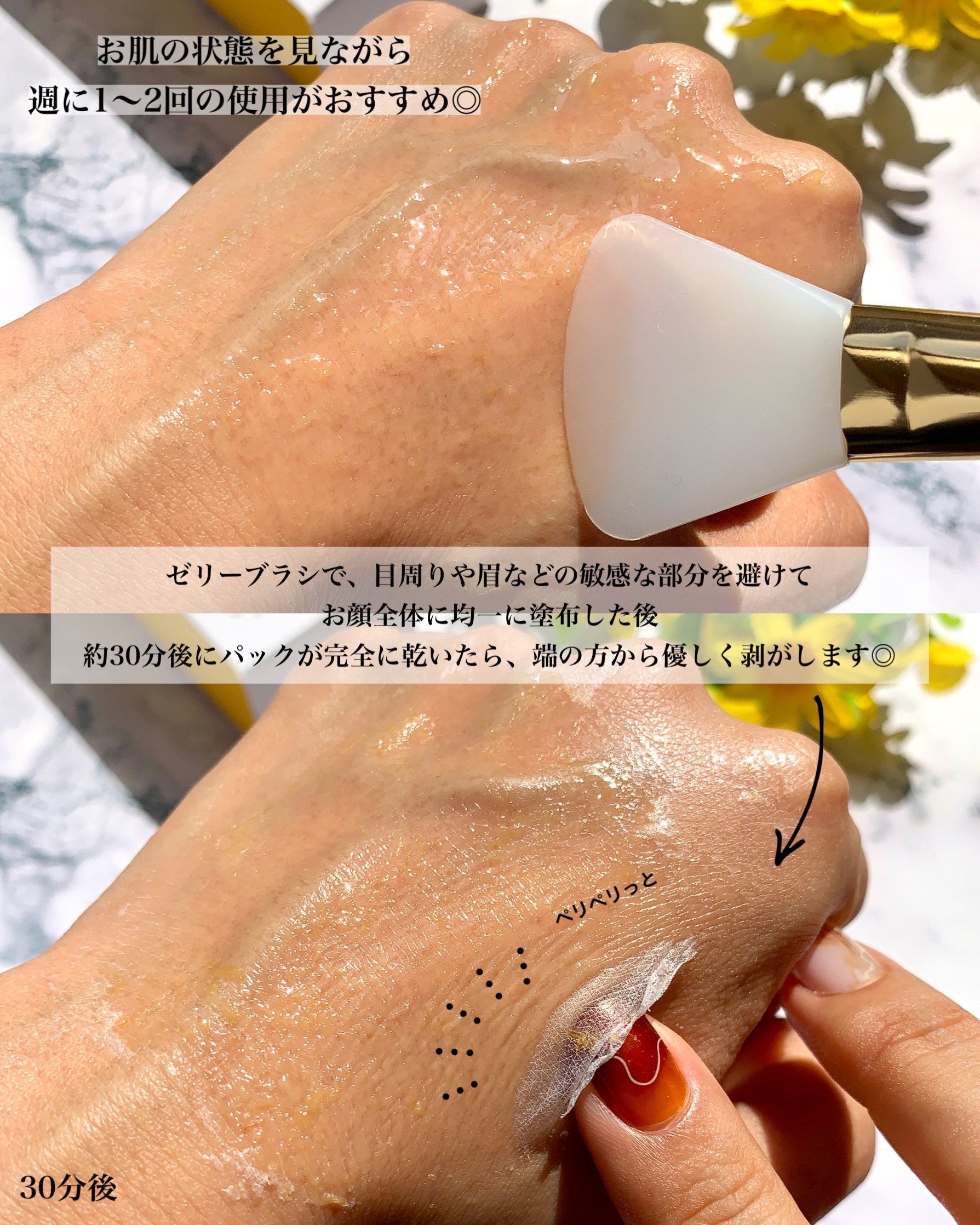 テクスチャーはトロトロしていて伸びが良いよ。 時間が経つにつれてマスクが固まってきて、まるで石化した気分に🤣笑 剥がすときは基本綺麗に剥がれるけど、髪の毛に付くと大変かも。 使用後の肌はワントーンアップした気がしたし、ザラつきもなくなったような🥰