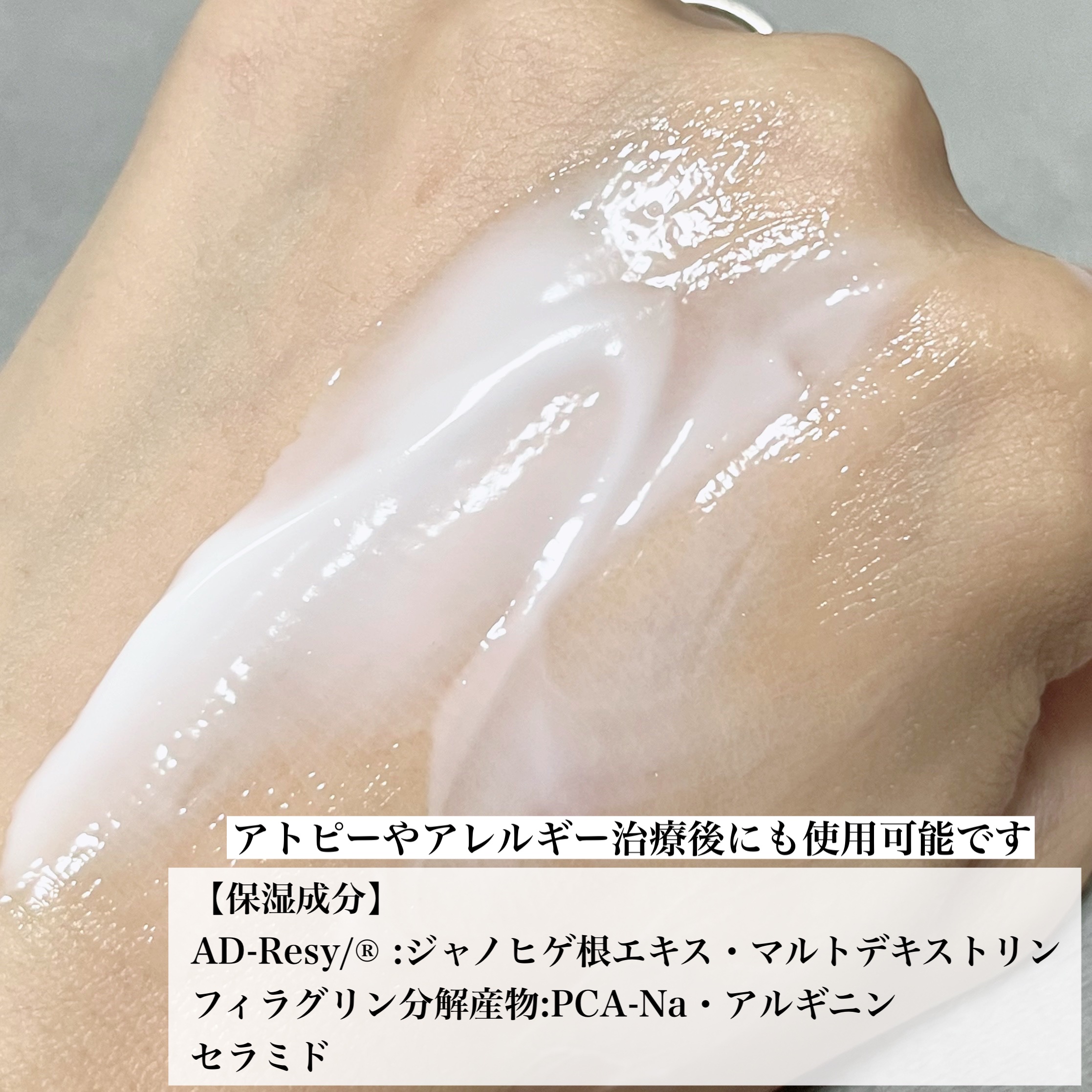- 【成分】水、グリセリン、トリ(カプリル酸/カプリン酸)グリセリル、ヒマワリ種子油、ペンチレングリコール、シア脂、シクロペンタシロキサン、セテアリルアルコール、ソルビトール、ベヘニルアルコール、ステアリン酸グリセリル、酢酸トコフェロール、セタノール、アルギニン、ナイアシンアミド、クエン酸ステアリン酸グリセリル、ポリアクリル酸Na、エチレンジコカミドPEG-15ジ硫酸2Na、カプリリルグリコール、セテアレス-20、PCA-Na、クエン酸、パンテノール、アラントイン、ジメチコノール、ジャノ ヒゲ根エキス、EDTA-2Na、ヒアルロン酸Na、マルトデキストリン、セラミドNP、パントラクトン